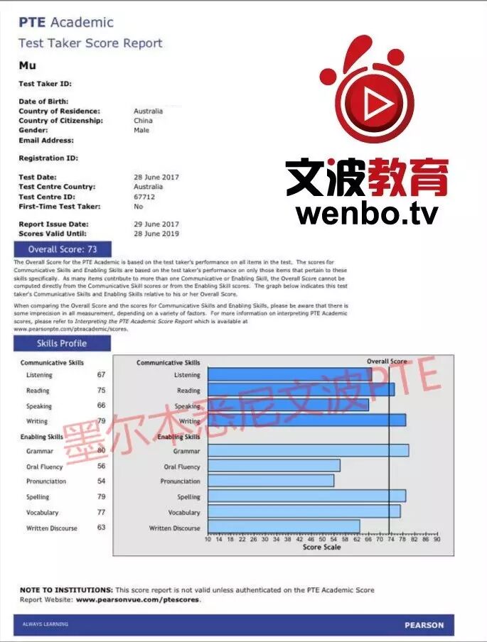 恭喜墨尔本悉尼文波PTE学员Mu获得听力67,阅读75,口语66,写作79,总分73分的好成绩!也是六月文波PTE第86位通过四个七四个八的学员.