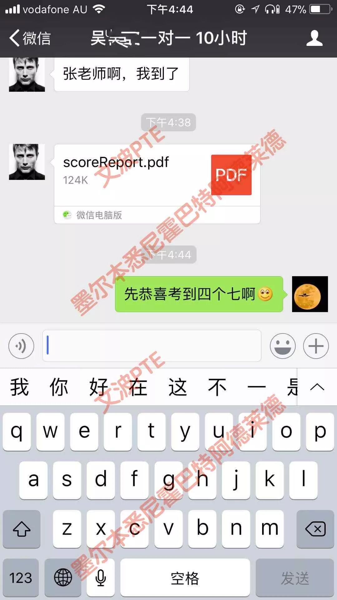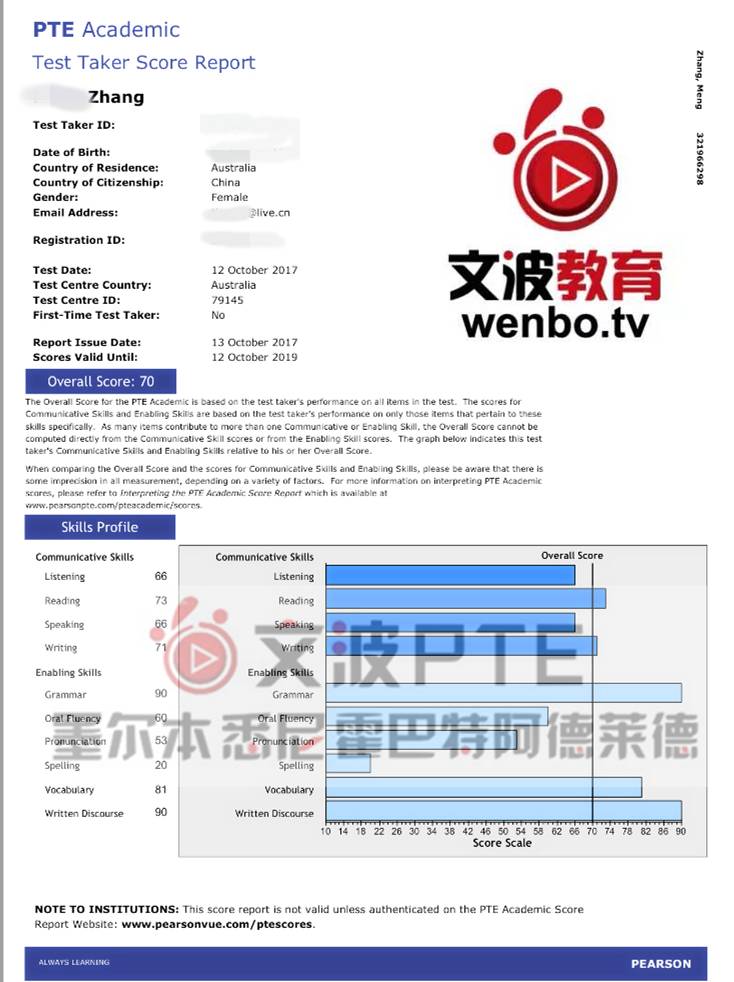 恭喜墨尔本悉尼霍巴特文波PTE学员Rhiamon同学获得听力66,阅读73,口语66,写作71,总分70分的好成绩!也是十一月文波PTE第47位通过四个七四个八的学员.