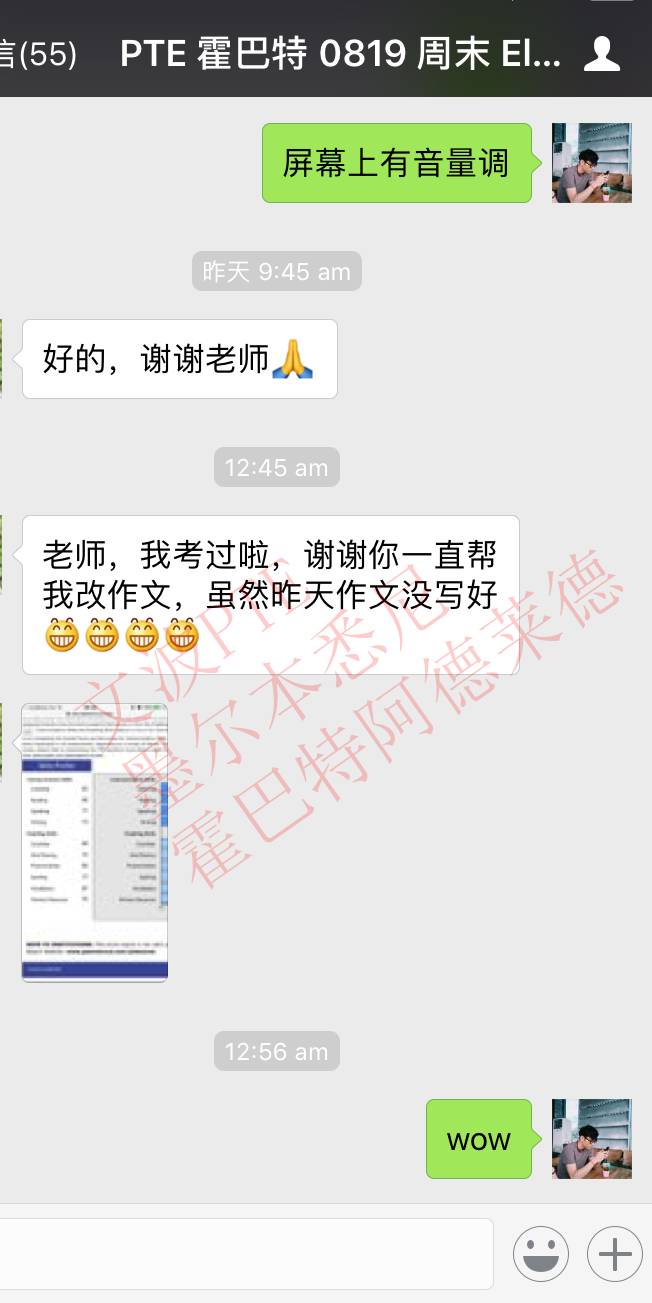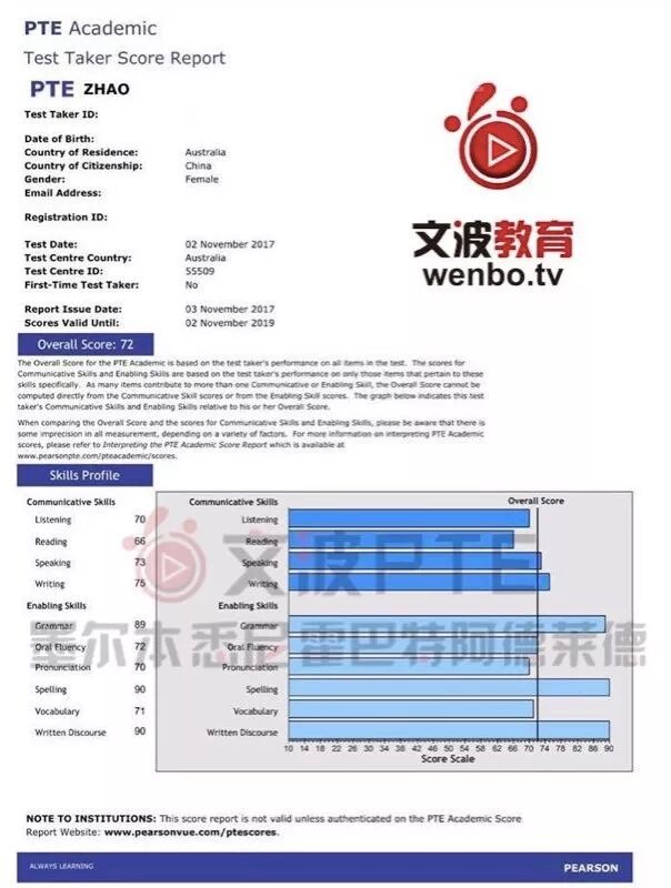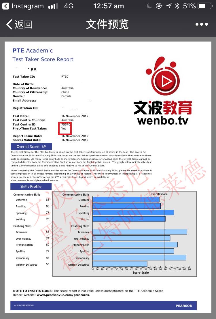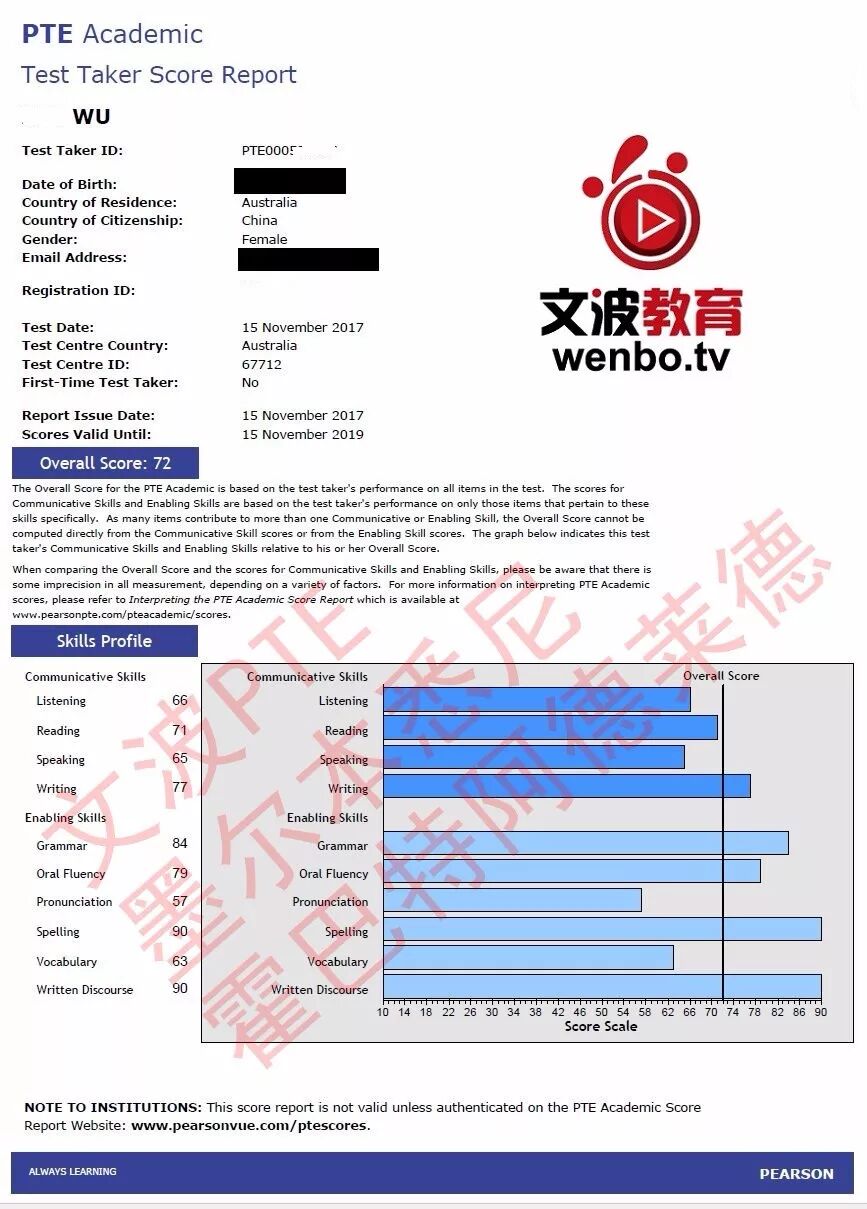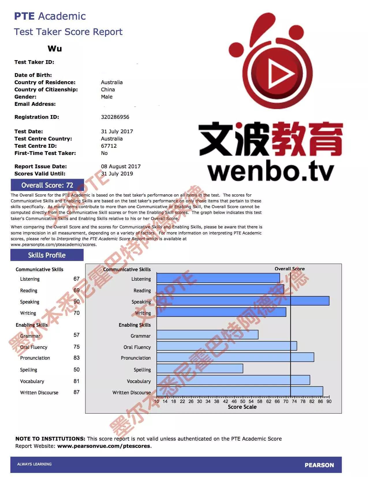 恭喜墨尔本悉尼霍巴特文波PTE学员Wu同学获得听力67,阅读69,口语90,写作70,总分72分的好成绩!也是十一月文波PTE第45位通过四个七四个八的学员.