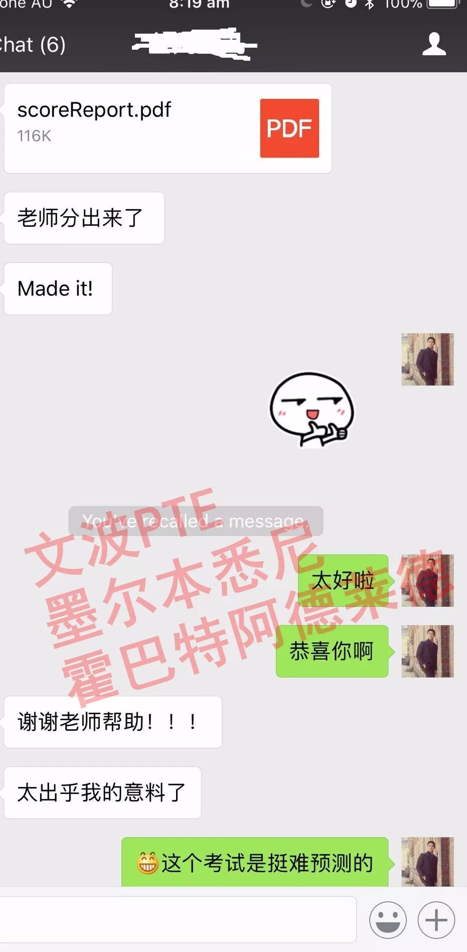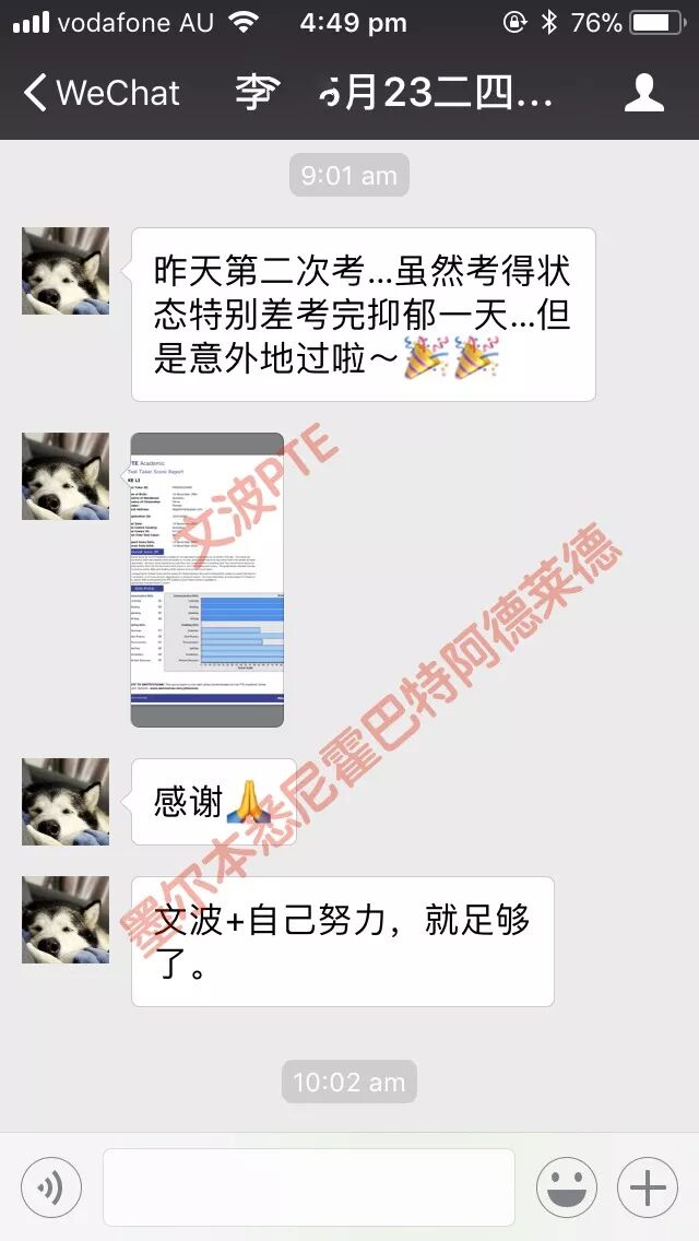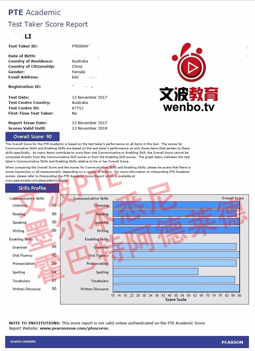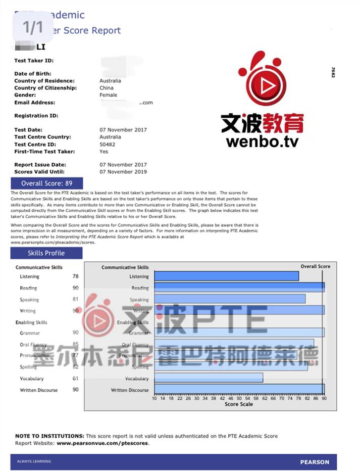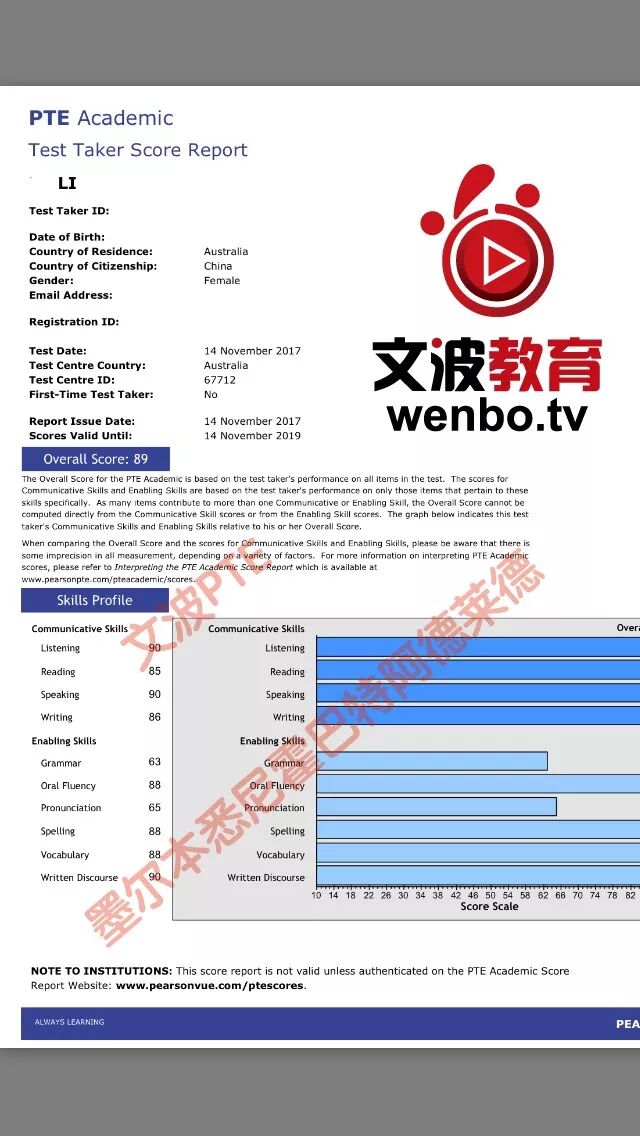 恭喜墨尔本悉尼霍巴特文波PTE学员Li同学获得听力90,阅读85,口语90,写作86,总分89分的好成绩!也是十一月文波PTE第44位通过四个七四个八的学员.