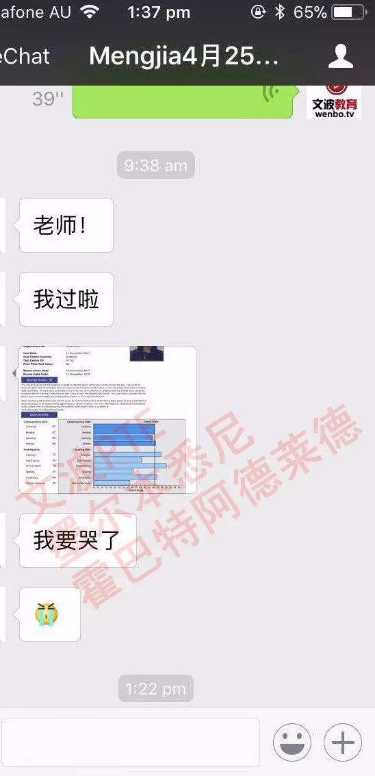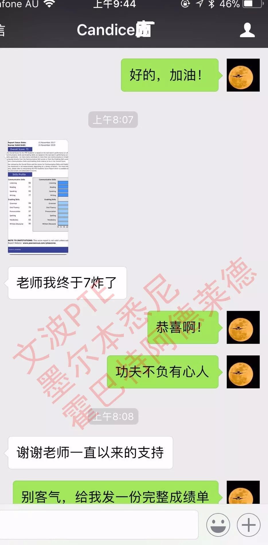 恭喜墨尔本悉尼霍巴特文波PTE学员Elaine同学获得听力65,阅读66,口语77,写作70,总分69分的好成绩!也是十一月文波PTE第50位通过四个七四个八的学员.
