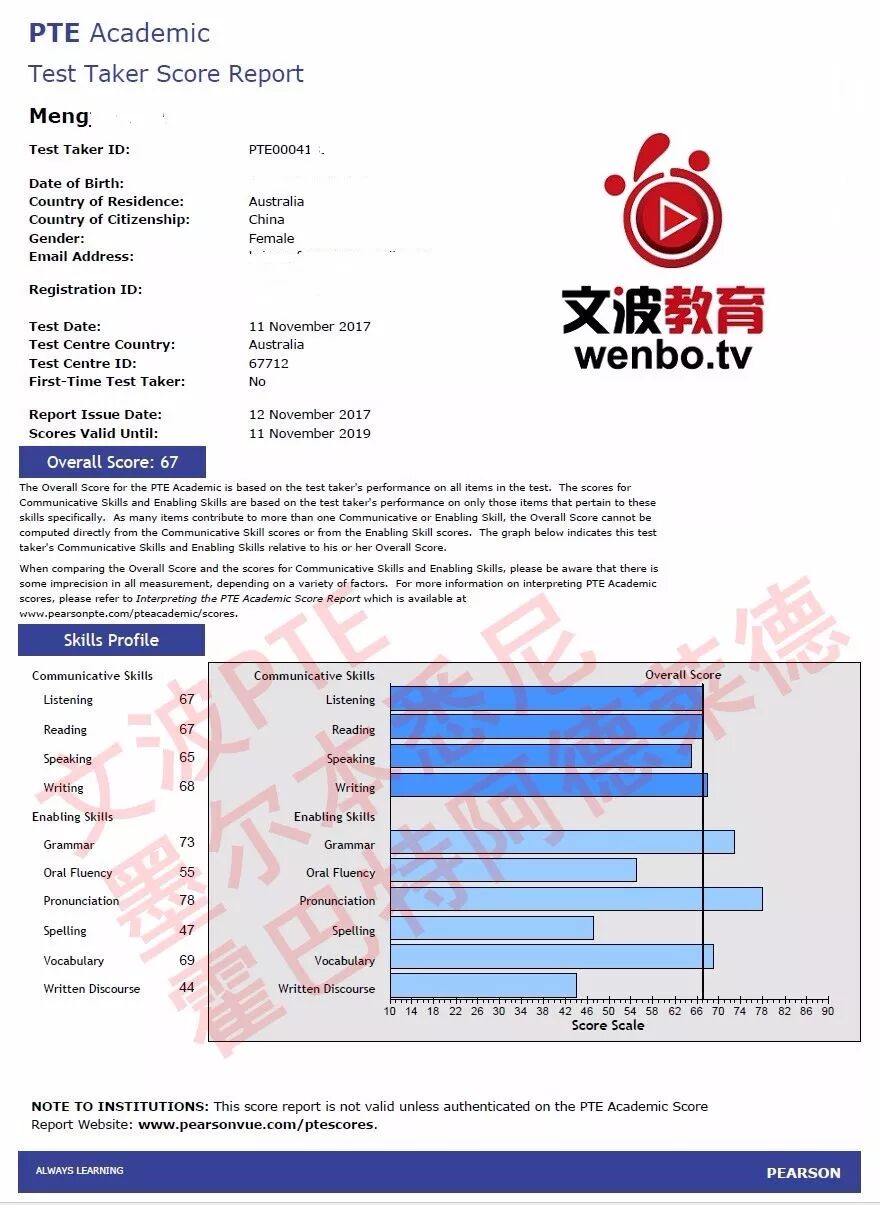 恭喜墨尔本悉尼霍巴特文波PTE学员Mengjia同学获得听力67,阅读67,口语65,写作68,总分67分的好成绩!也是十一月文波PTE第41位通过四个七四个八的学员.