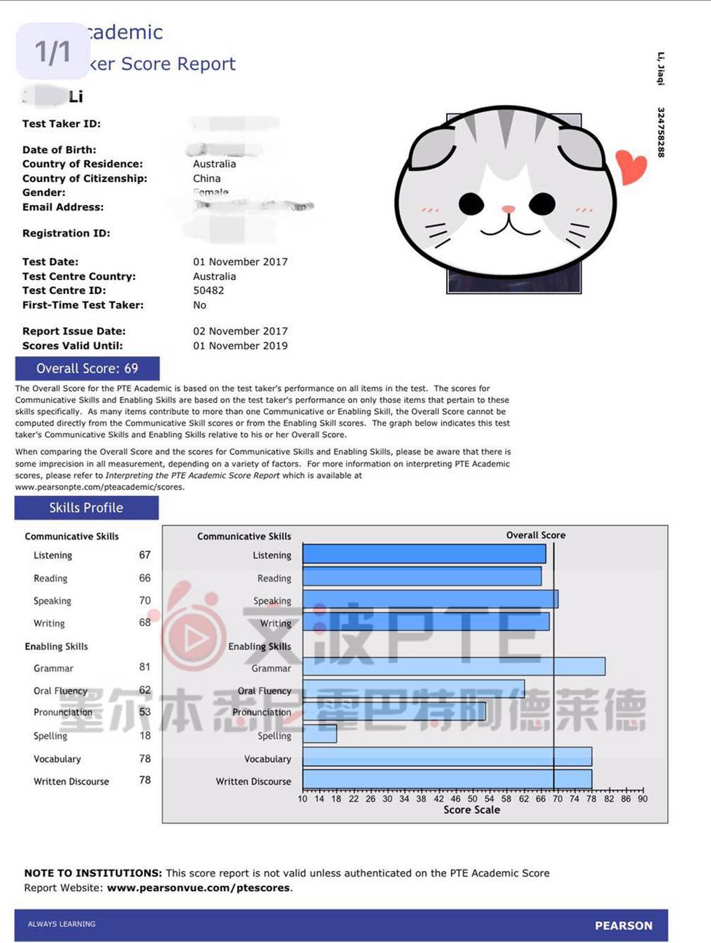 恭喜墨尔本悉尼霍巴特文波PTE学员Cathy同学获得听力70,阅读66,口语73,写作75,总分72分的好成绩!也是十一月文波PTE第42位通过四个七四个八的学员.