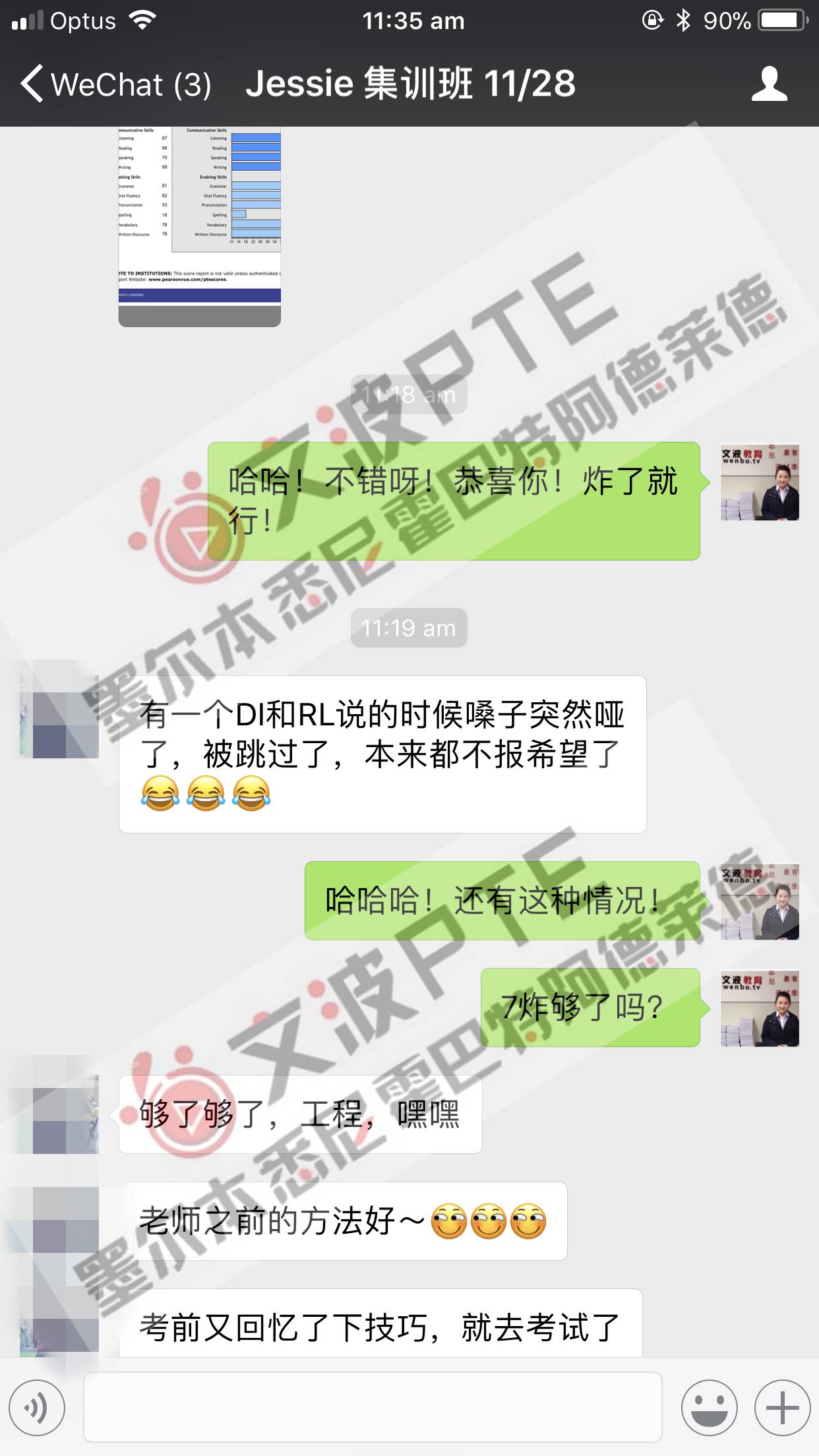 恭喜墨尔本悉尼霍巴特文波PTE学员Kiki同学获得听力90,阅读88,口语90,写作90,总分90分的好成绩!也是十一月文波PTE第43位通过四个七四个八的学员.