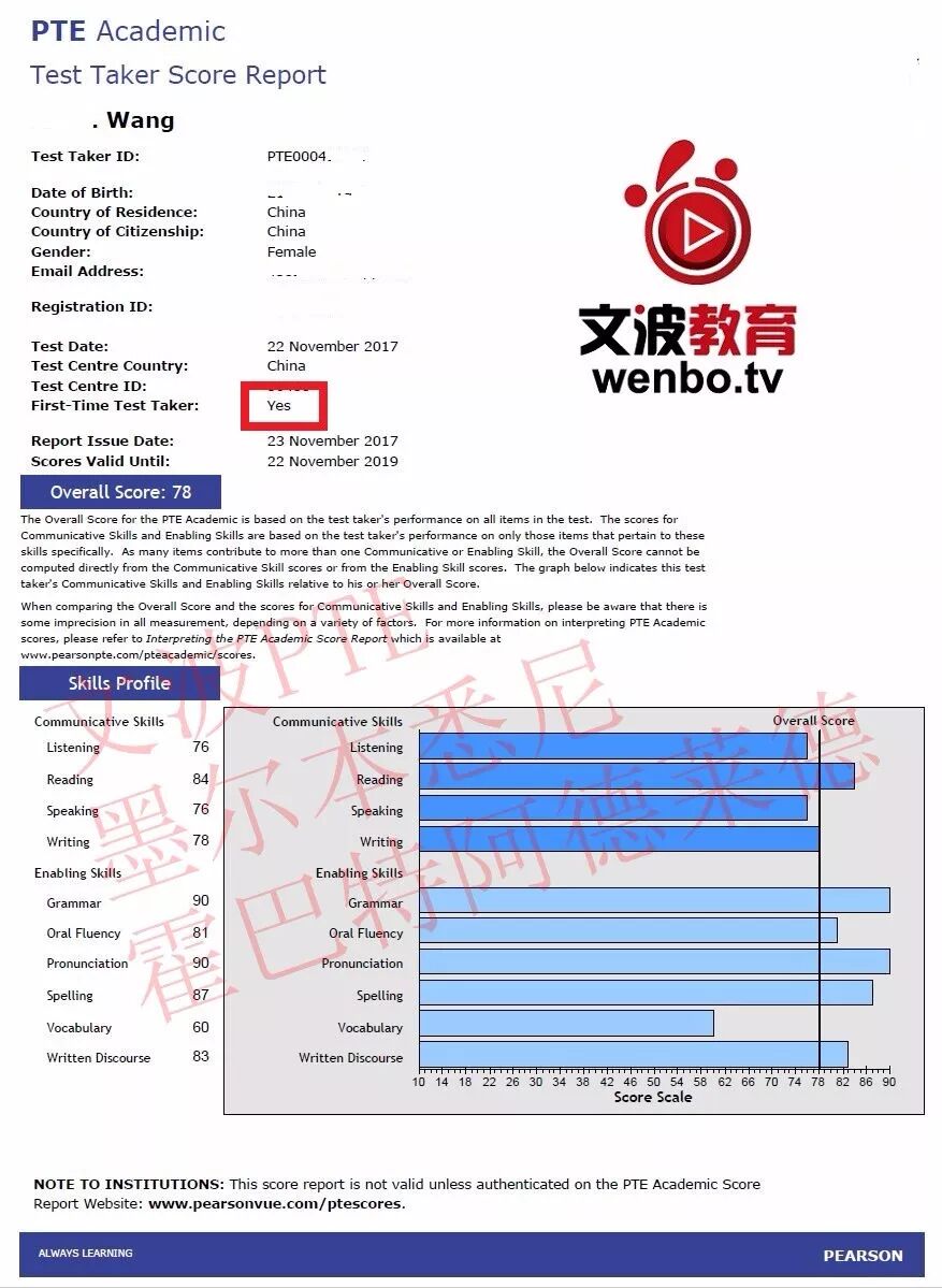 恭喜墨尔本悉尼霍巴特文波PTE学员Cathy同学获得听力76,阅读84,口语76,写作78,总分78分的好成绩!也是十一月文波PTE第75位通过四个七四个八的学员.