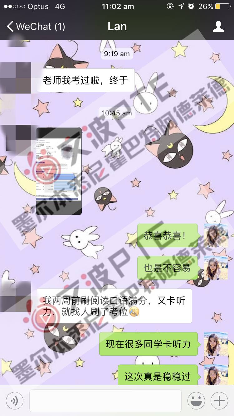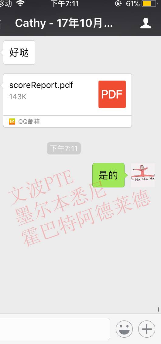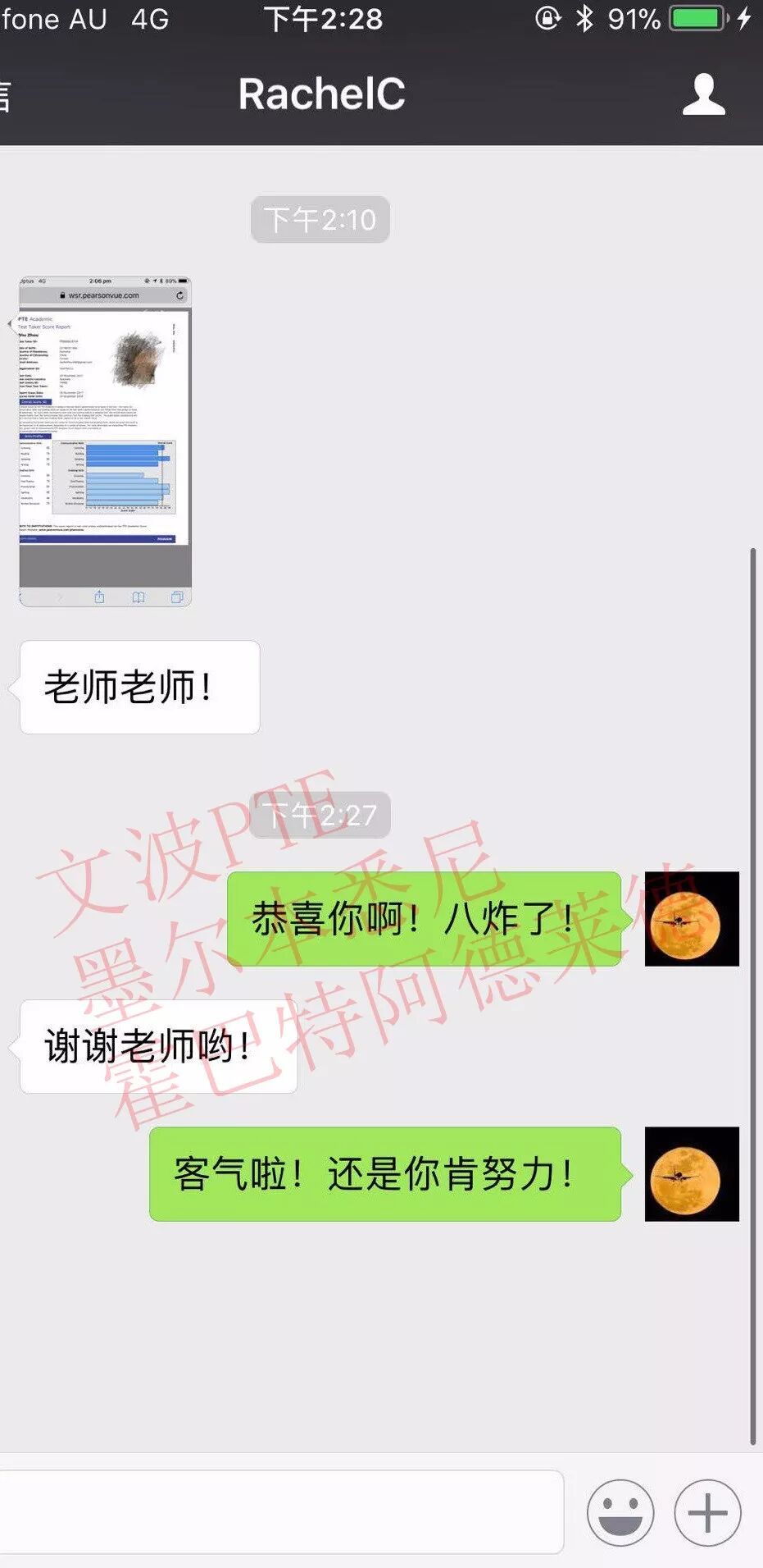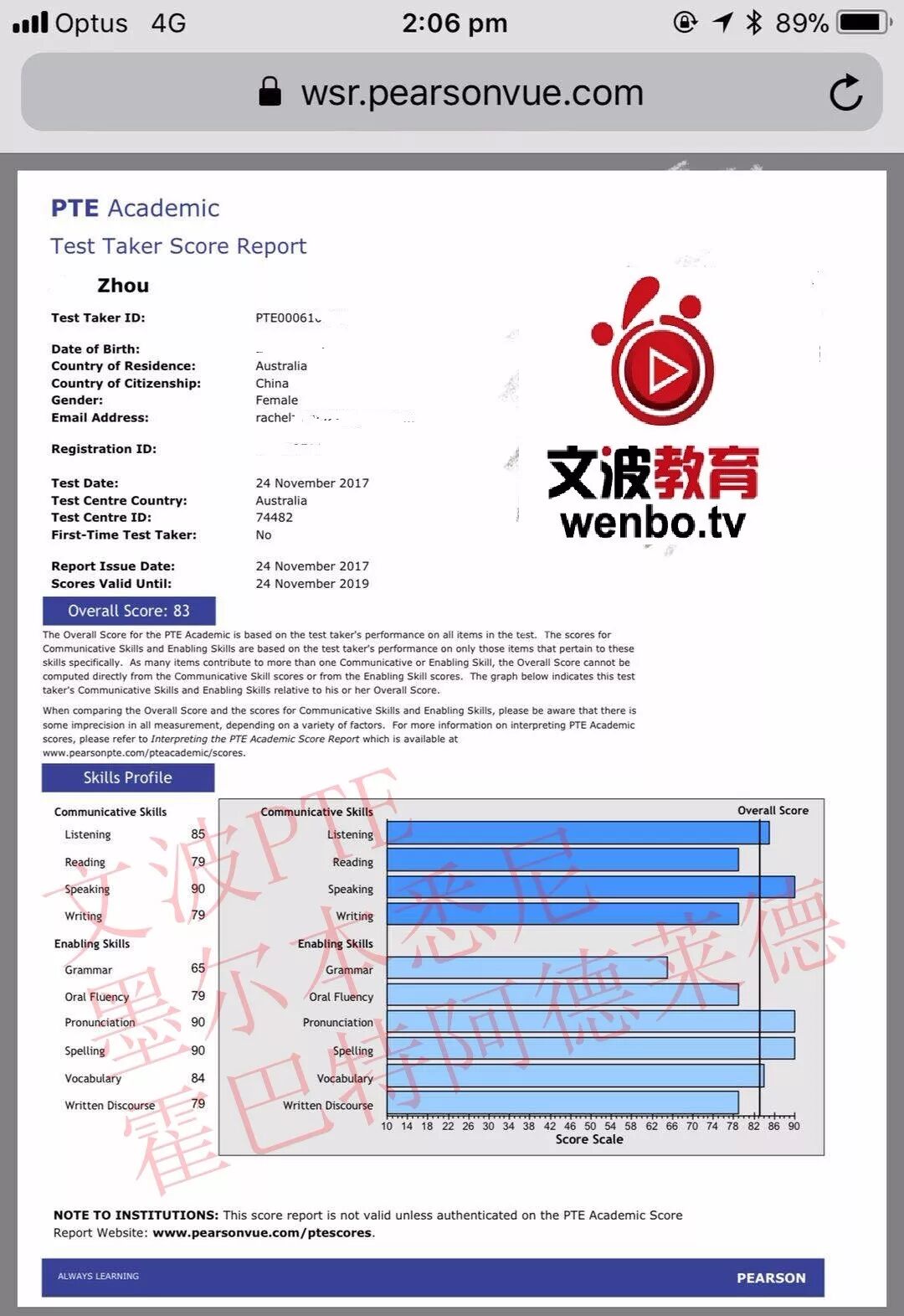 恭喜墨尔本悉尼霍巴特文波PTE学员Rachel同学获得听力85,阅读79,口语90,写作79,总分83分的好成绩!也是十一月文波PTE第74位通过四个七四个八的学员.