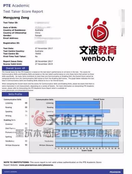 恭喜墨尔本悉尼霍巴特文波PTE学员Mandy同学获得听力66,阅读66,口语79,写作71,总分69分的好成绩!也是十一月文波PTE第80位通过四个七四个八的学员.