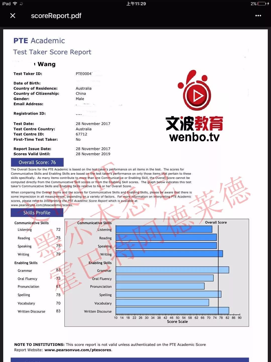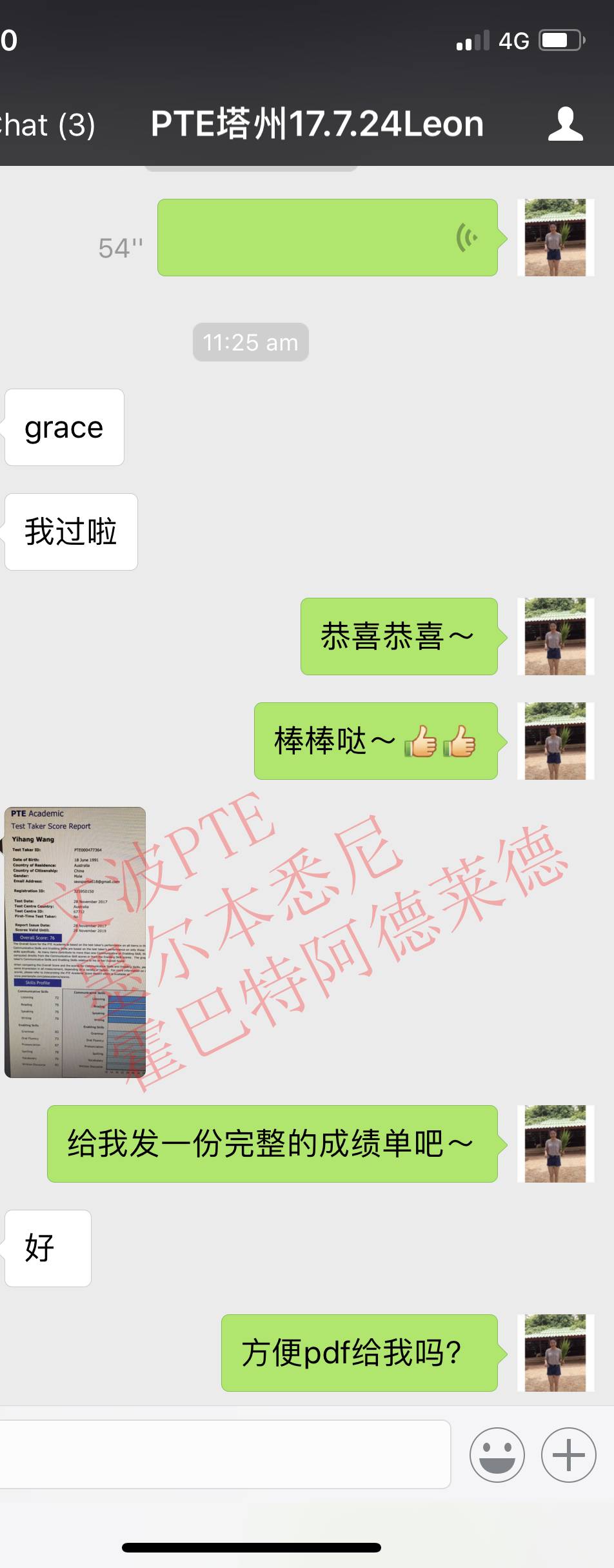 恭喜墨尔本悉尼霍巴特文波PTE学员Leon同学获得听力72,阅读75,口语75,写作79,总分76分的好成绩!也是十一月文波PTE第79位通过四个七四个八的学员.