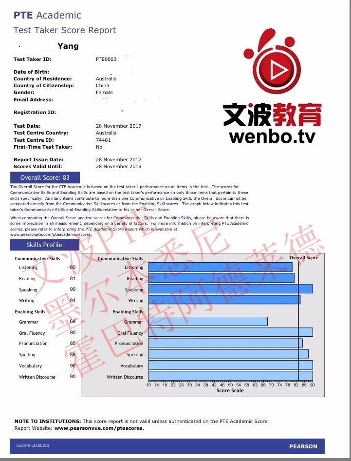 恭喜墨尔本悉尼霍巴特文波PTE学员Sarah同学获得听力80,阅读79,口语90,写作81,总分82分的好成绩!也是十一月文波PTE第77位通过四个七四个八的学员.