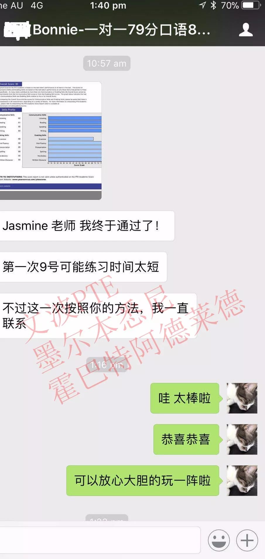 恭喜墨尔本悉尼霍巴特文波PTE学员Jessica同学获得听力70,阅读78,口语90,写作70,总分74分的好成绩!也是十一月文波PTE第71位通过四个七四个八的学员.