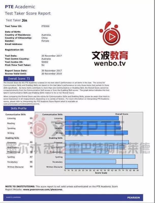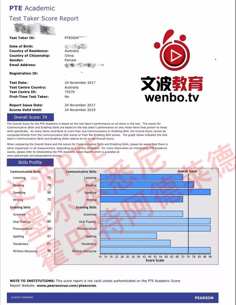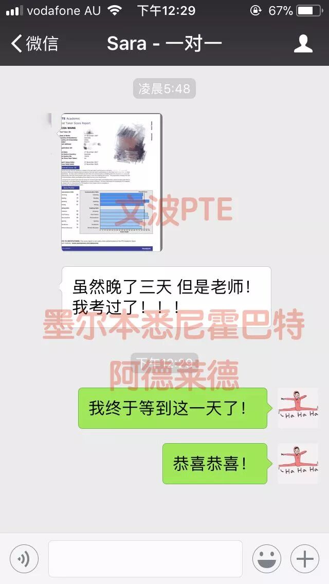 恭喜墨尔本悉尼霍巴特文波PTE学员Wendy同学获得听力69,阅读70,口语71,写作79,总分73分的好成绩!也是十一月文波PTE第76位通过四个七四个八的学员.