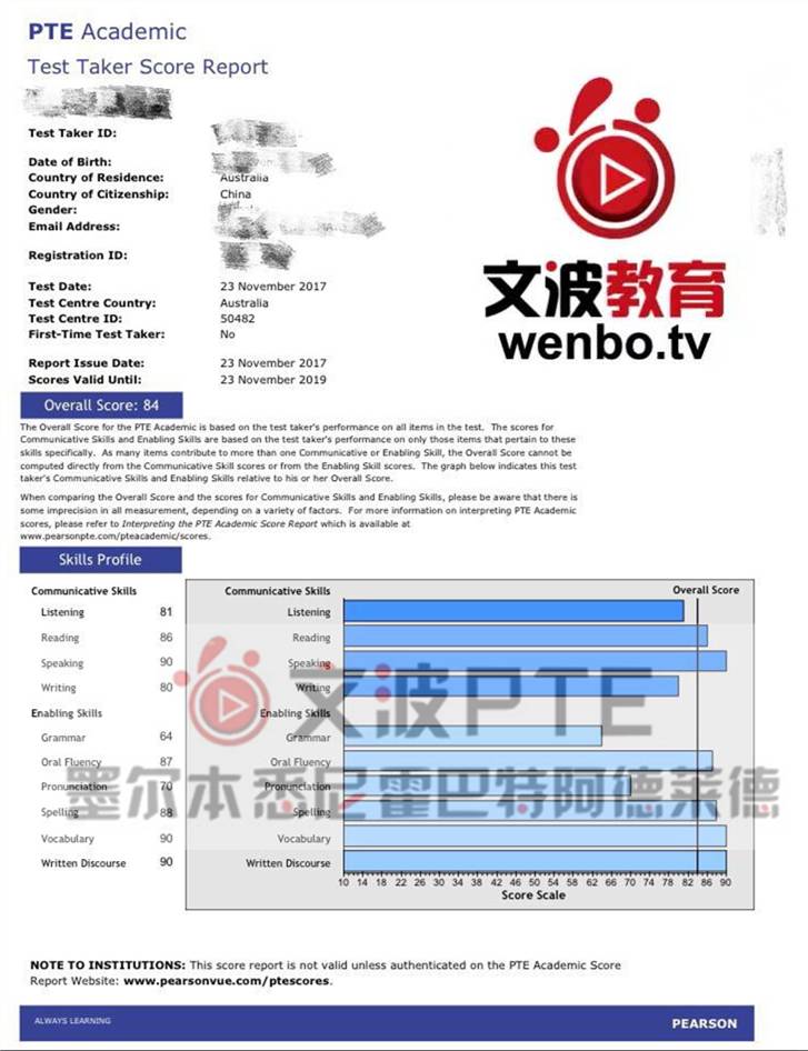 恭喜墨尔本悉尼霍巴特文波PTE学员Lan同学获得听力81,阅读86,口语90,写作80,总分84分的好成绩!也是十一月文波PTE第72位通过四个七四个八的学员.