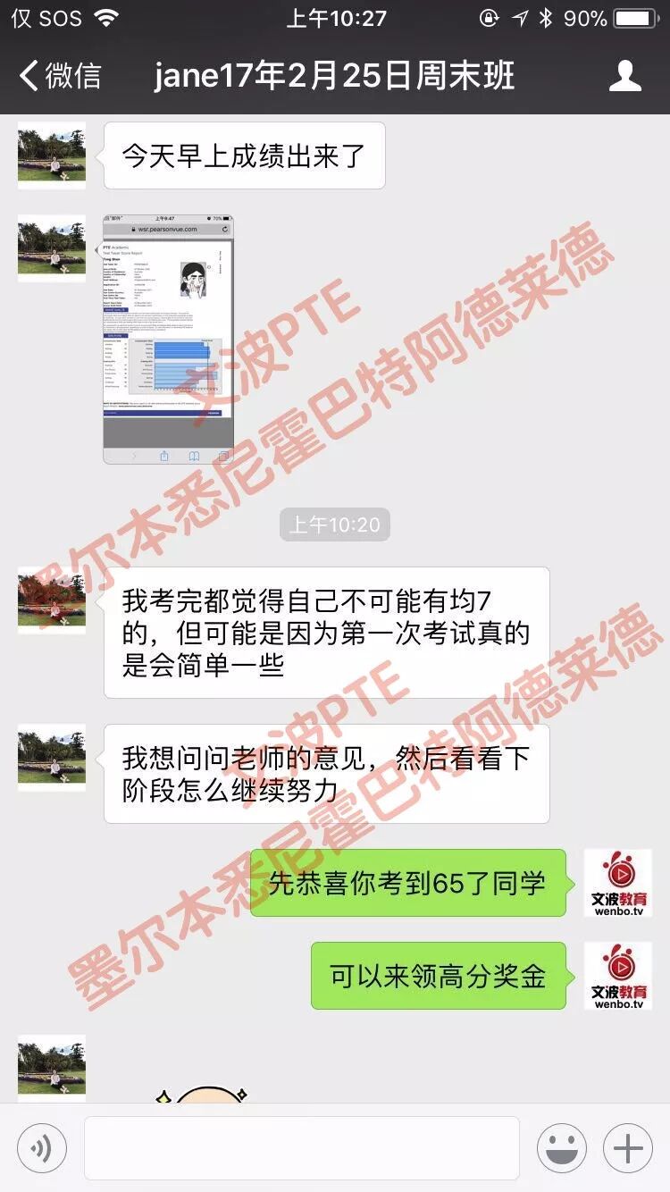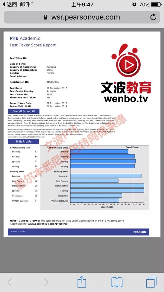 恭喜墨尔本悉尼霍巴特阿德莱德文波PTE学员Shen同学获得听力68,阅读70,口语90,写作66,总分70分的好成绩!也是十二月文波PTE第10位通过四个七四个八的学员.