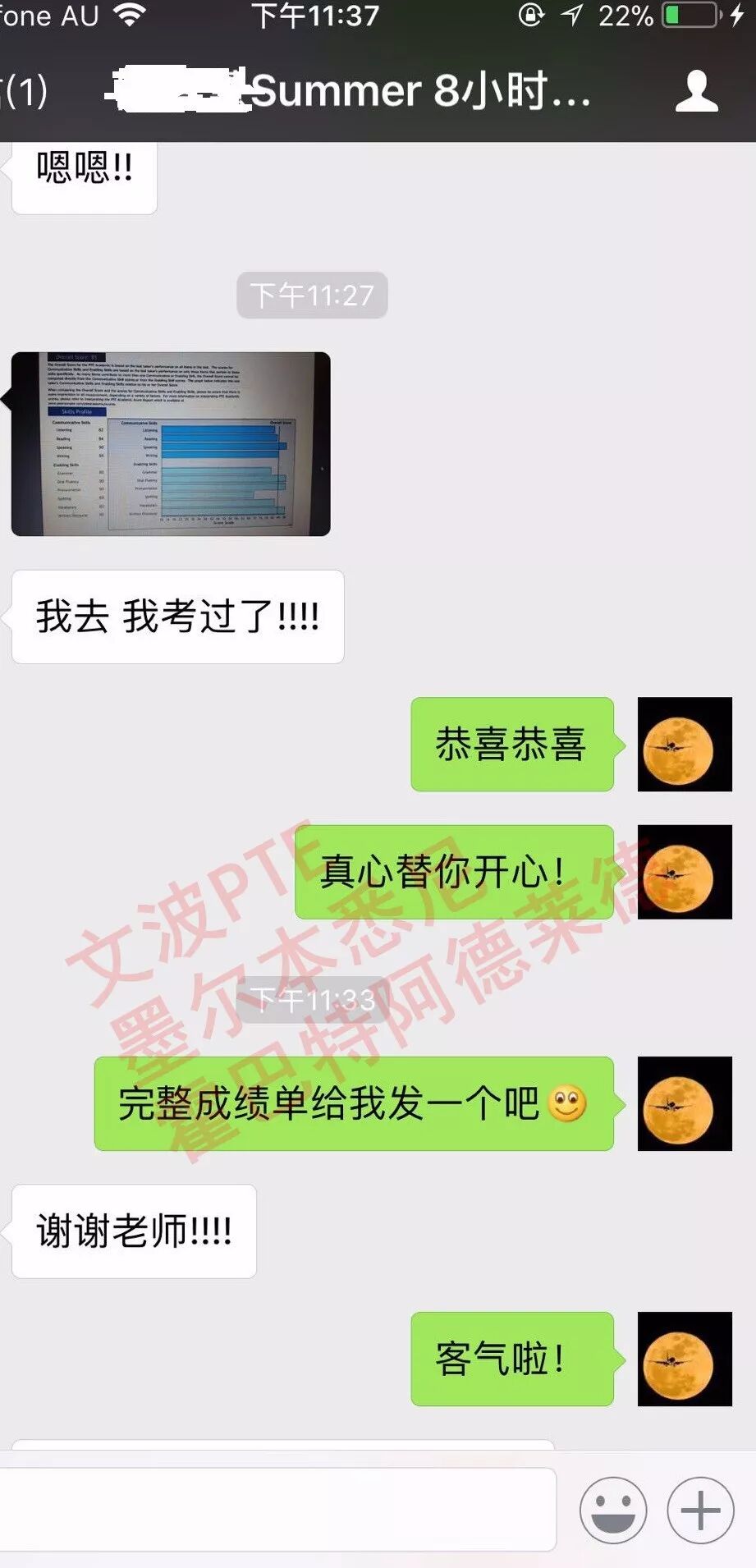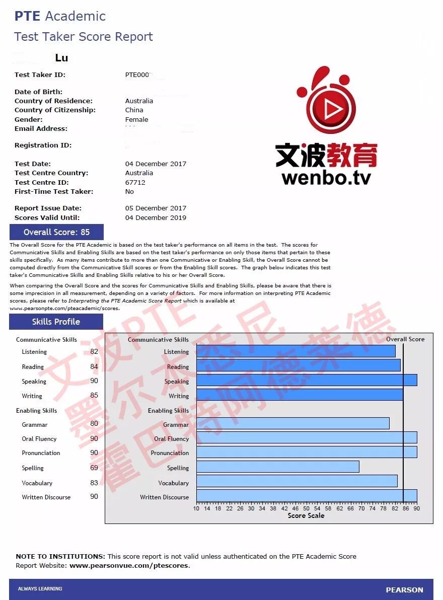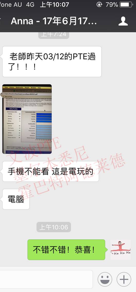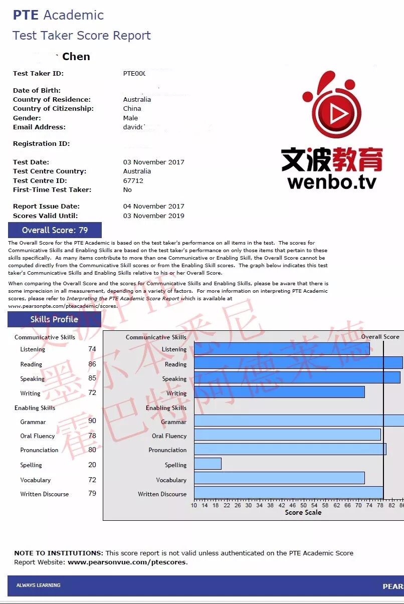 恭喜墨尔本悉尼霍巴特阿德莱德文波PTE学员Chen同学获得听力74,阅读86,口语85,写作72,总分79分的好成绩!也是十二月文波PTE第6位通过四个七四个八的学员.