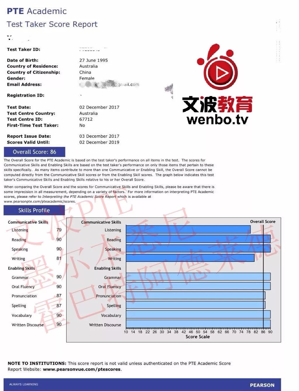 恭喜墨尔本悉尼霍巴特阿德莱德文波PTE学员Nicole同学获得听力79,阅读90,口语90,写作81,总分86分的好成绩!也是十二月文波PTE第5位通过四个七四个八的学员.