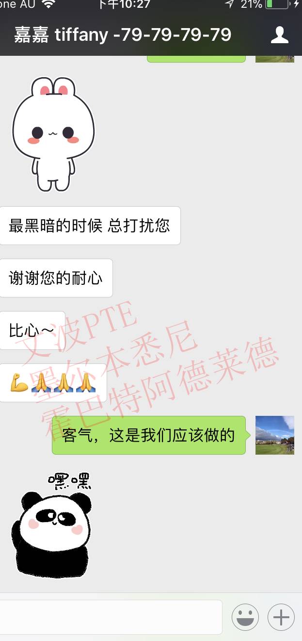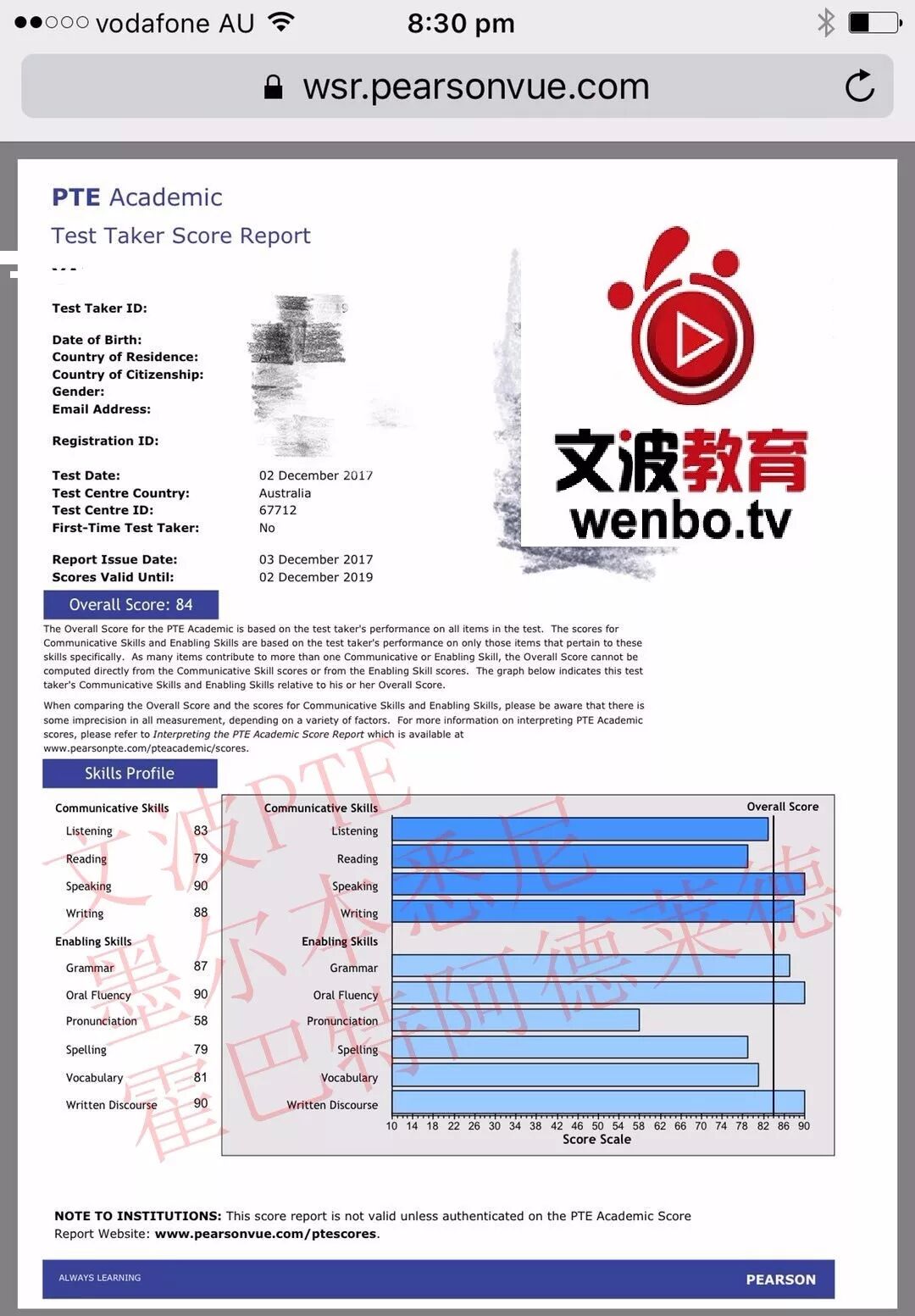 恭喜墨尔本悉尼霍巴特阿德莱德文波PTE学员Tiffany同学获得听力83,阅读79,口语90,写作88,总分84分的好成绩!也是十二月文波PTE第4位通过四个七四个八的学员.