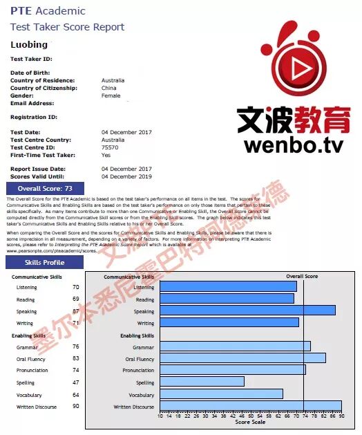 恭喜墨尔本悉尼霍巴特阿德莱德文波PTE学员Luobing同学获得听力70,阅读69,口语87,写作71,总分73分的好成绩!也是十二月文波PTE第8位通过四个七四个八的学员.