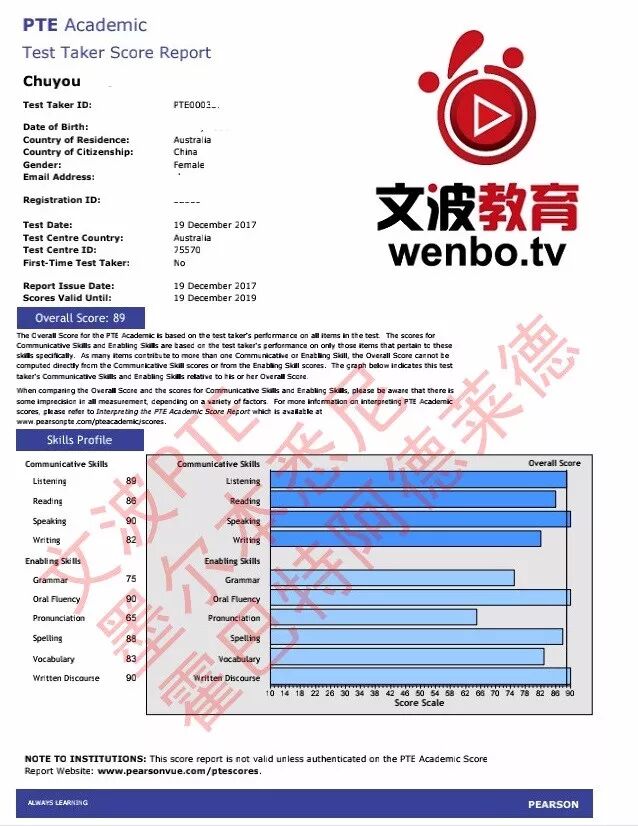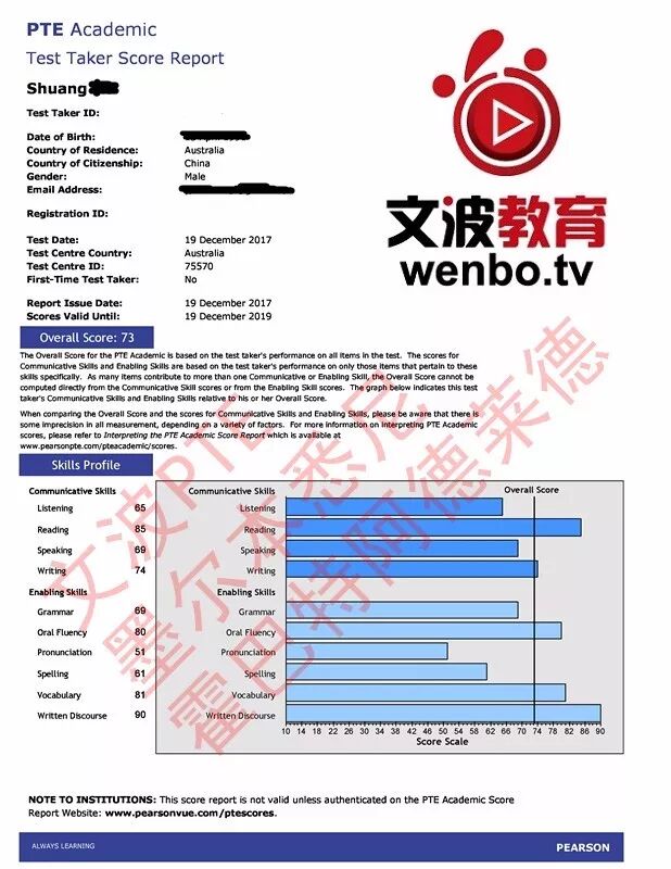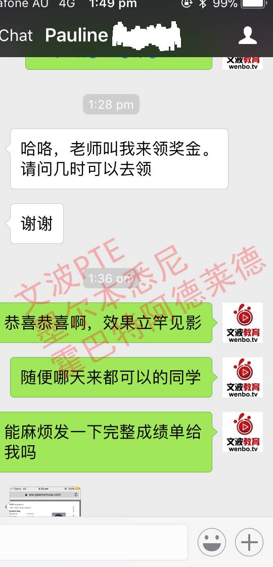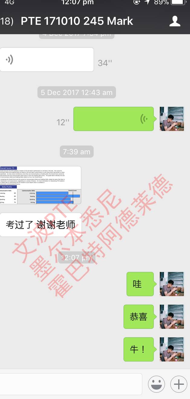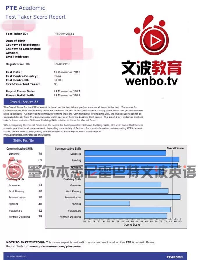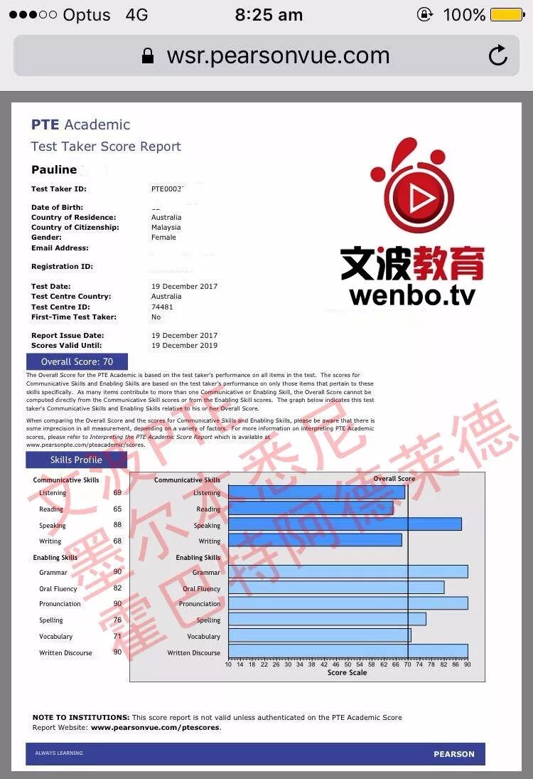 恭喜墨尔本悉尼霍巴特阿德莱德文波PTE学员Pauline同学获得听力69,阅读65,口语88,写作68,总分70分的好成绩!也是十二月文波PTE第48位通过四个七四个八的学员。