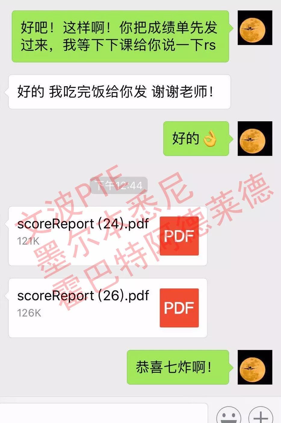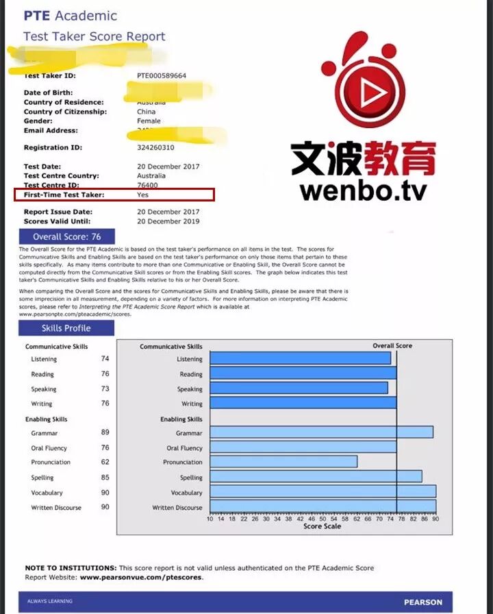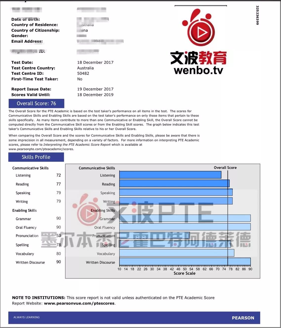 恭喜墨尔本悉尼霍巴特阿德莱德文波PTE学员Fiona同学获得听力74,阅读76,口语73,写作76,总分76分的好成绩!也是十二月文波PTE第46位通过四个七四个八的学员。