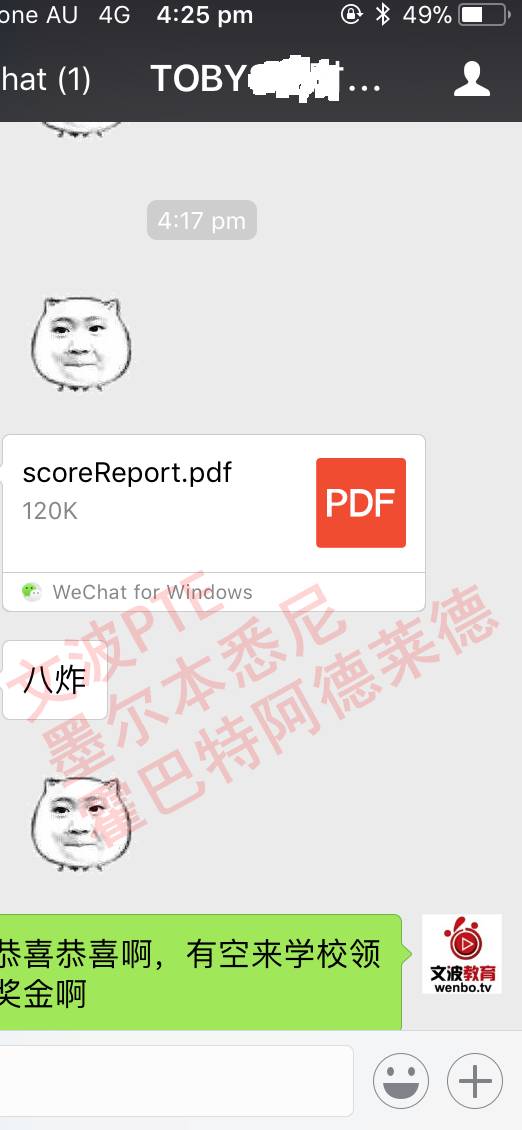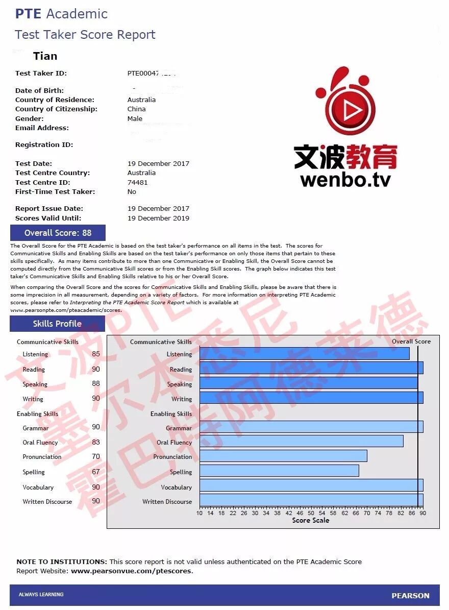恭喜墨尔本悉尼霍巴特阿德莱德文波PTE学员Toby同学获得听力85,阅读90,口语88,写作90,总分88分的好成绩!也是十二月文波PTE第49位通过四个七四个八的学员。