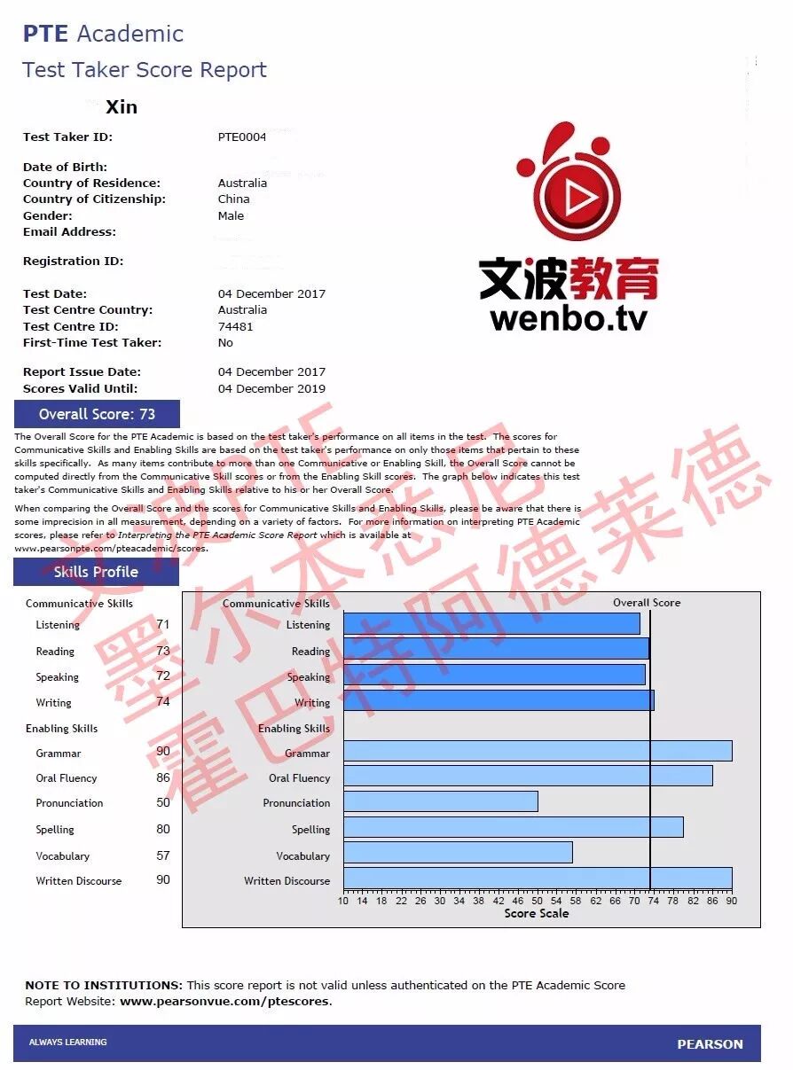 恭喜墨尔本悉尼霍巴特阿德莱德文波PTE学员Xin同学获得听力71,阅读73,口语72,写作74,总分73分的好成绩!也是十二月文波PTE第47位通过四个七四个八的学员。