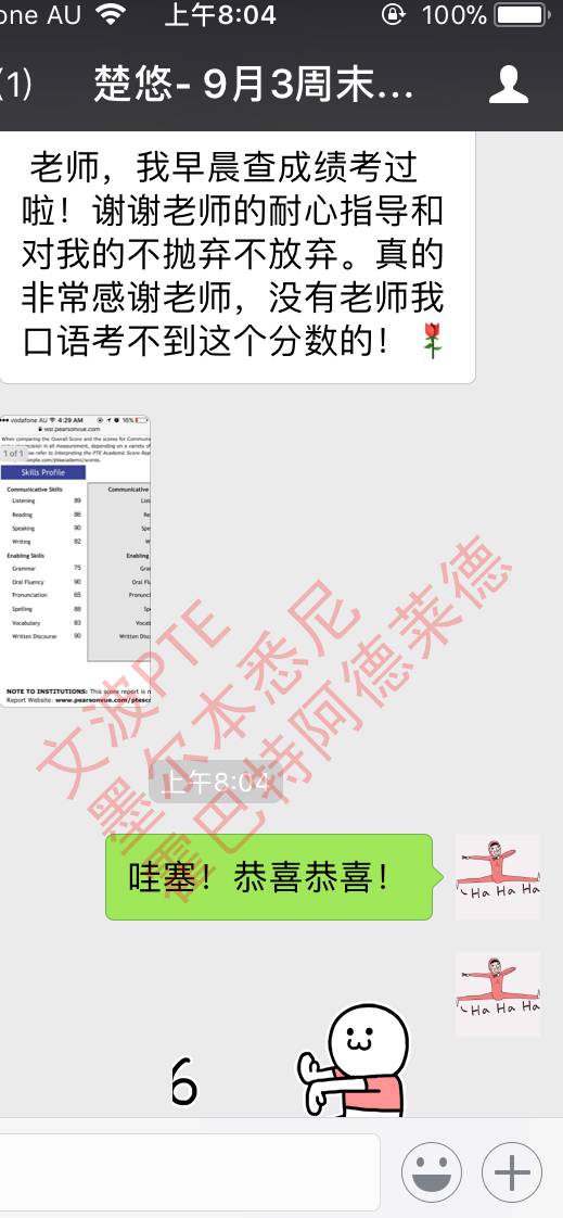 恭喜墨尔本悉尼霍巴特阿德莱德文波PTE学员Leon同学获得听力72,阅读77,口语79,写作79,总分76分的好成绩!也是十二月文波PTE第44位通过四个七四个八的学员。