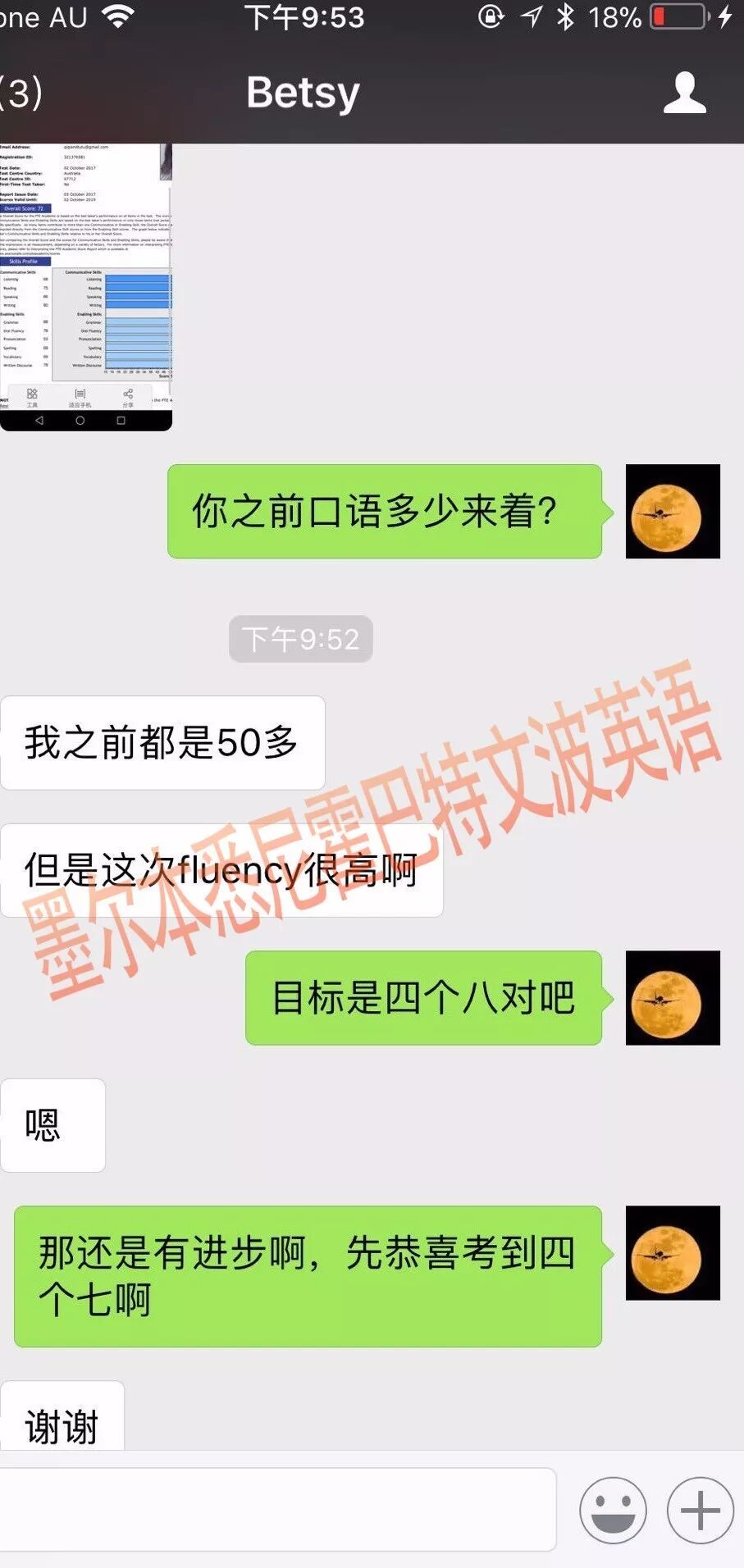 恭喜墨尔本悉尼霍巴特文波PTE学员Besty获得听力68,阅读75,口语66,写作80,总分72分的好成绩!也是十月文波PTE第21位通过四个七四个八的学员.