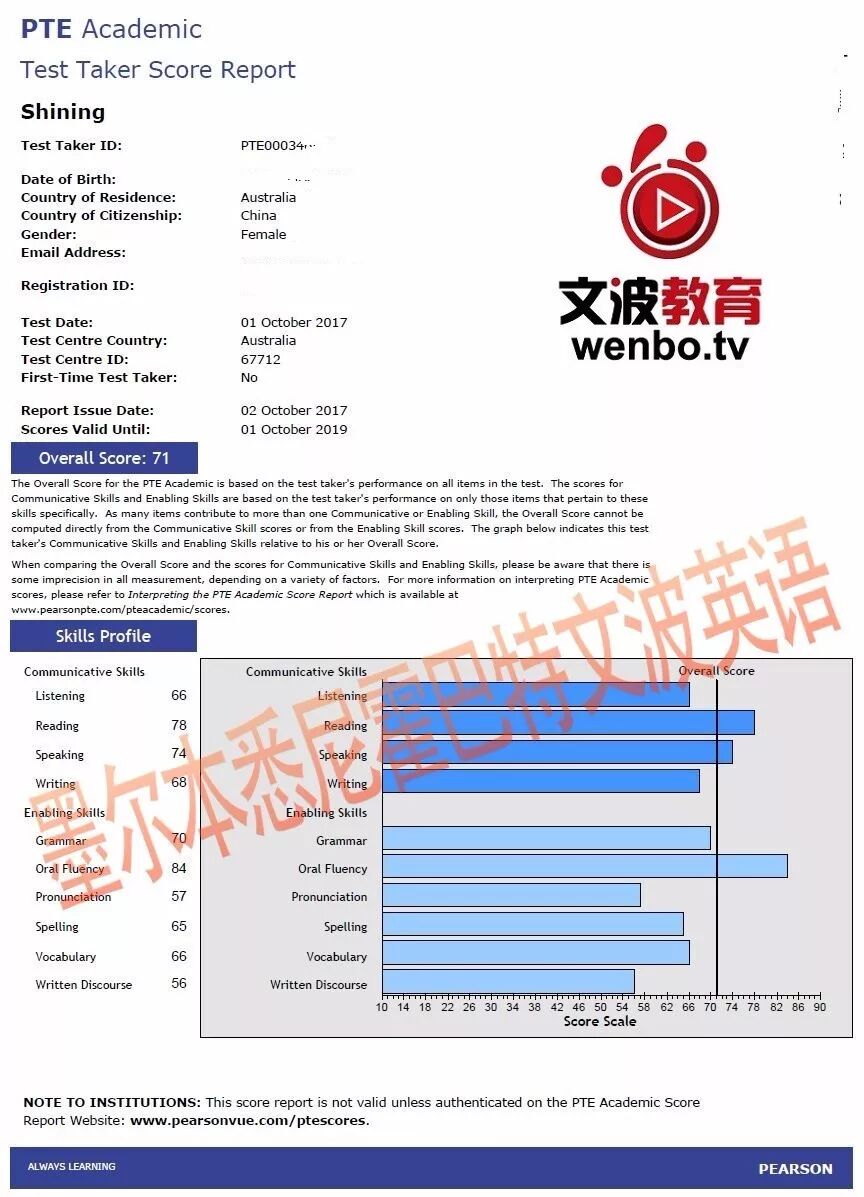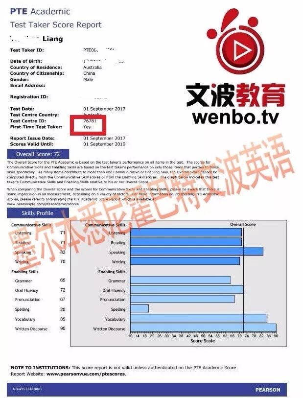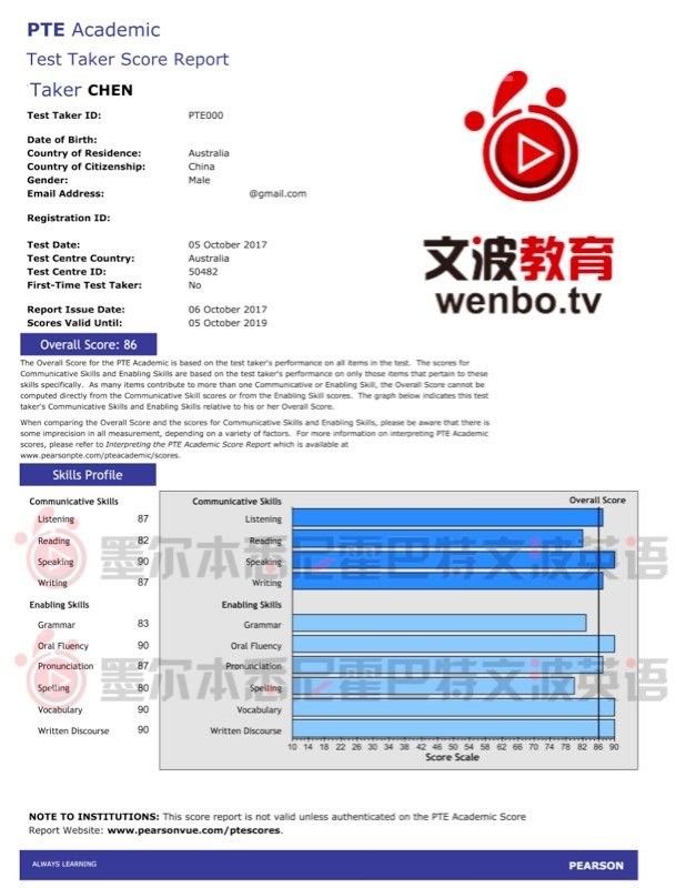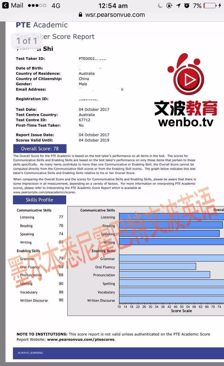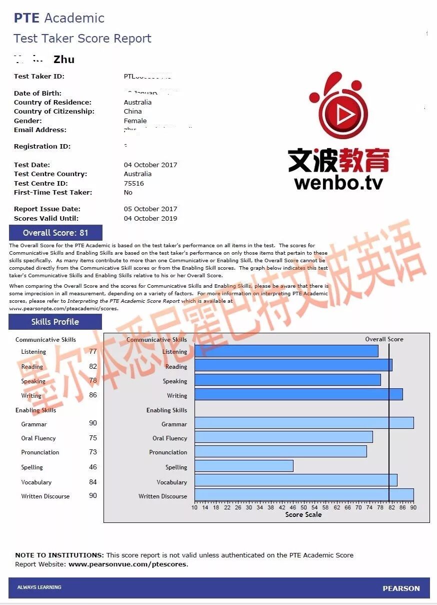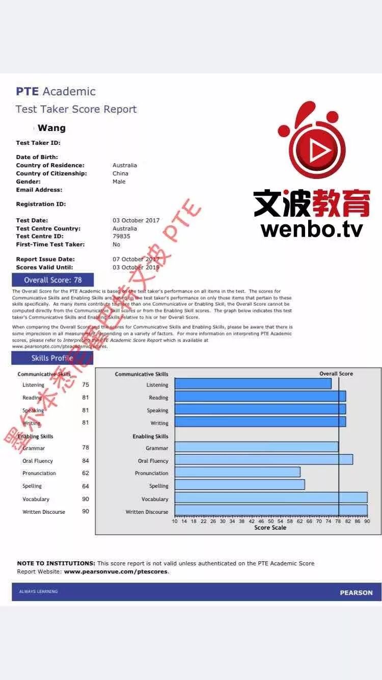 恭喜墨尔本悉尼霍巴特文波PTE学员Wang获得听力75,阅读81,口语81,写作81,总分78分的好成绩!也是十月文波PTE第29位通过四个七四个八的学员.