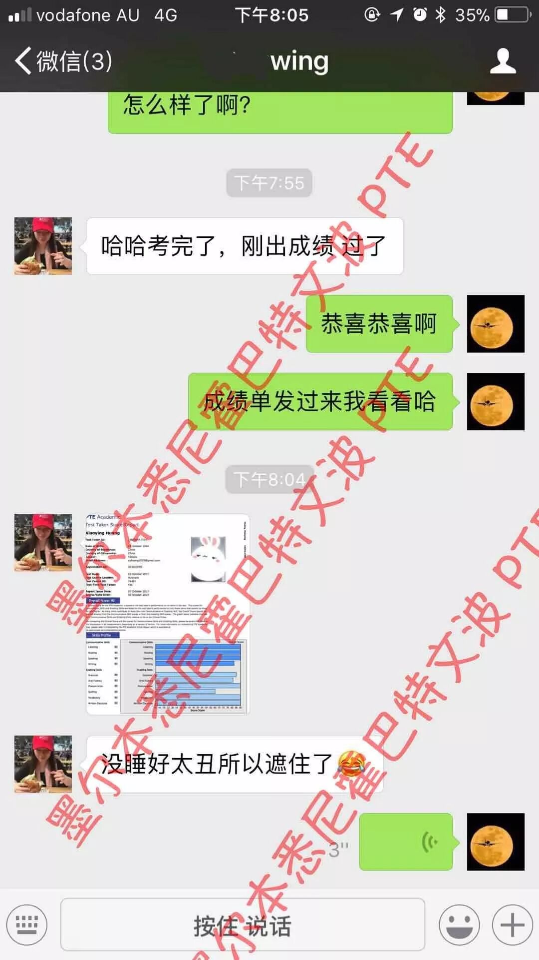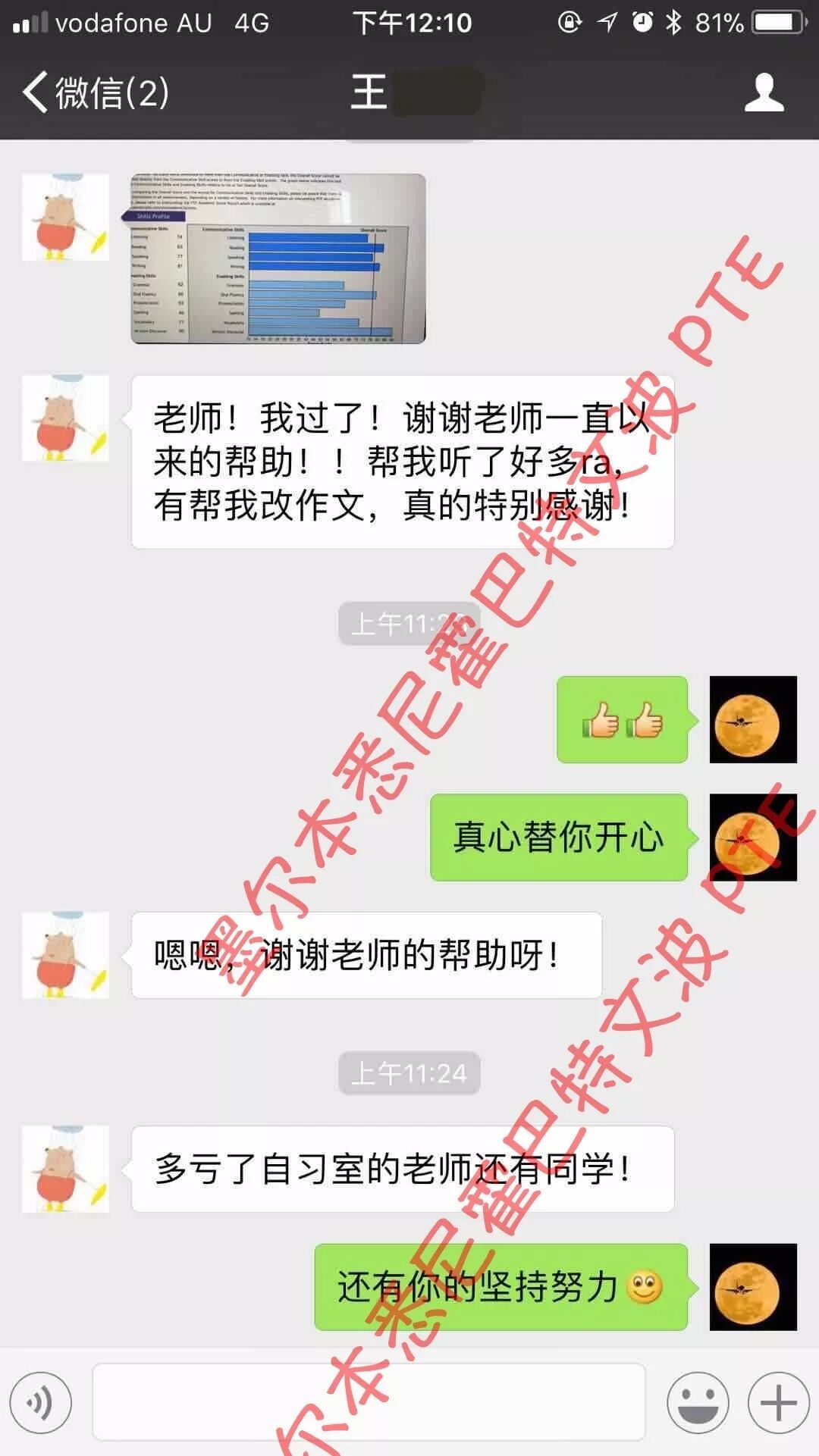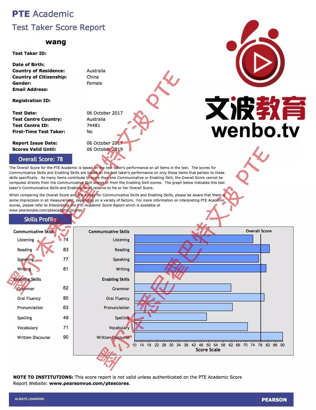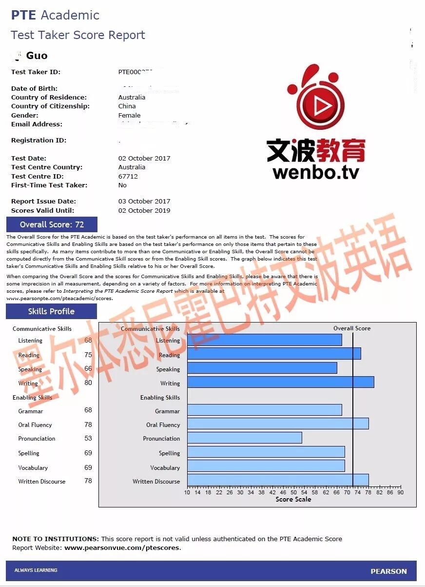 恭喜墨尔本悉尼霍巴特文波PTE学员Wang获得听力75,阅读81,口语81,写作81,总分78分的好成绩!也是十月文波PTE第29位通过四个七四个八的学员.