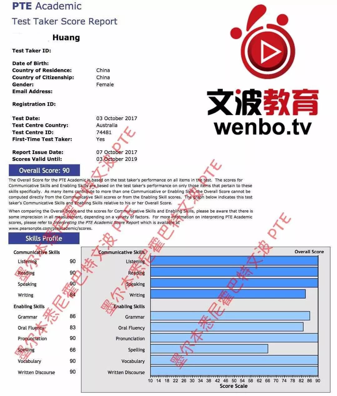 恭喜墨尔本悉尼霍巴特文波PTE学员Wing获得听力90,阅读90,口语90,写作84,总分90分的好成绩!也是十月文波PTE第27位通过四个七四个八的学员.