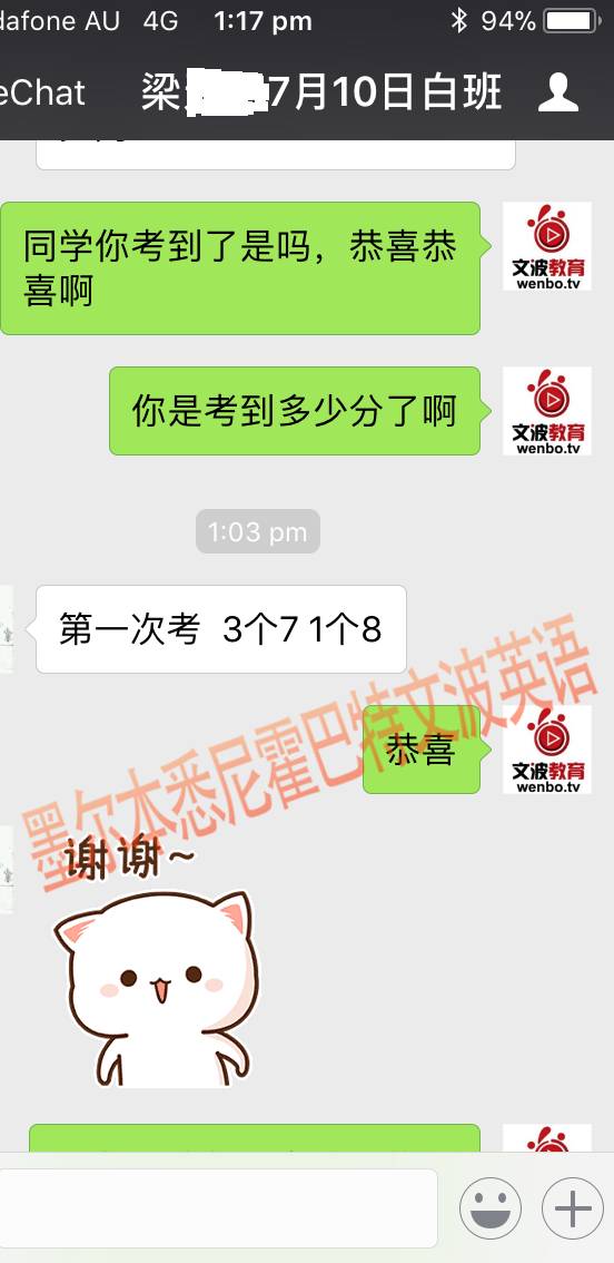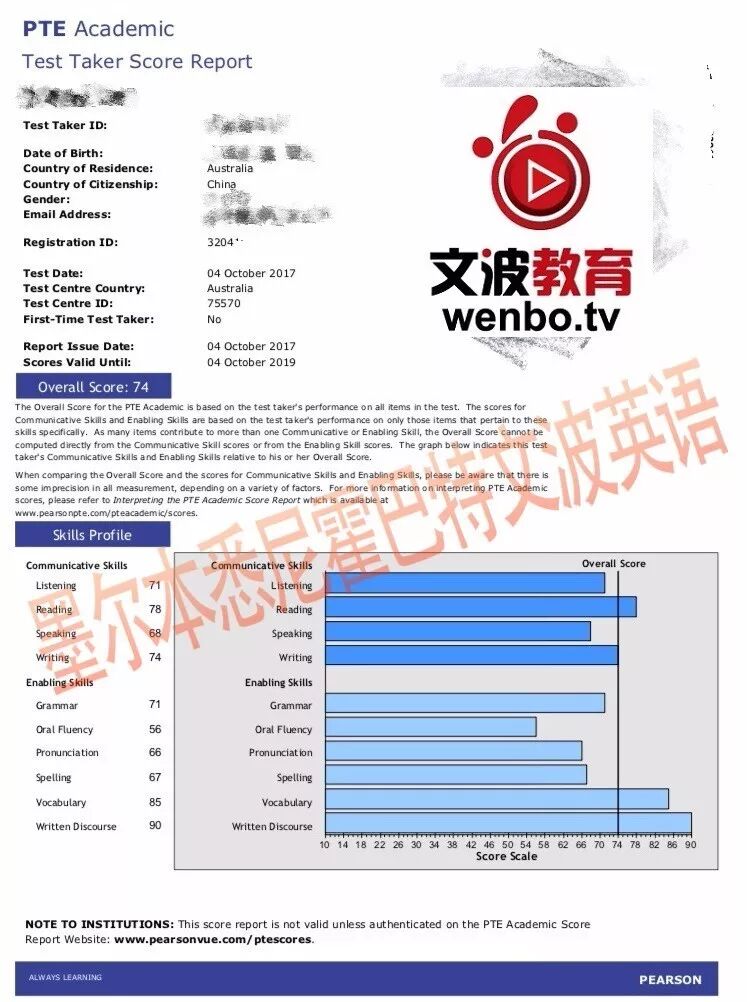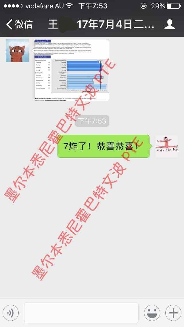 恭喜墨尔本悉尼霍巴特文波PTE学员Wang同学获得听力74,阅读83,口语77,写作81,总分78分的好成绩!也是十月文波PTE第30位通过四个七四个八的学员.