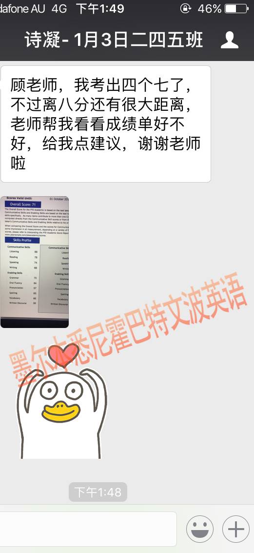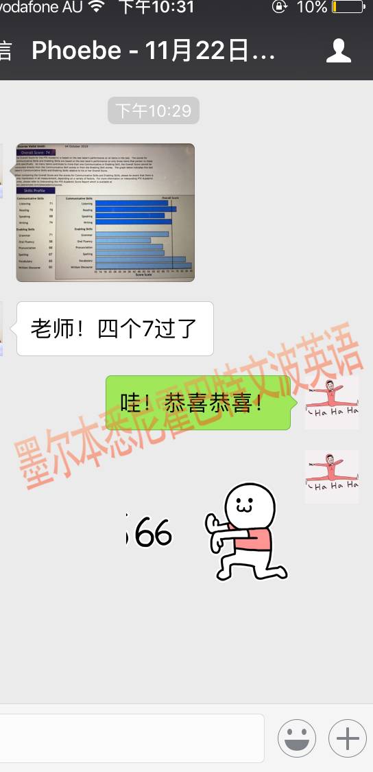 恭喜墨尔本悉尼霍巴特文波PTE学员Phoebe获得听力71,阅读78,口语68,写作74,总分74分的好成绩!也是十月文波PTE第25位通过四个七四个八的学员.