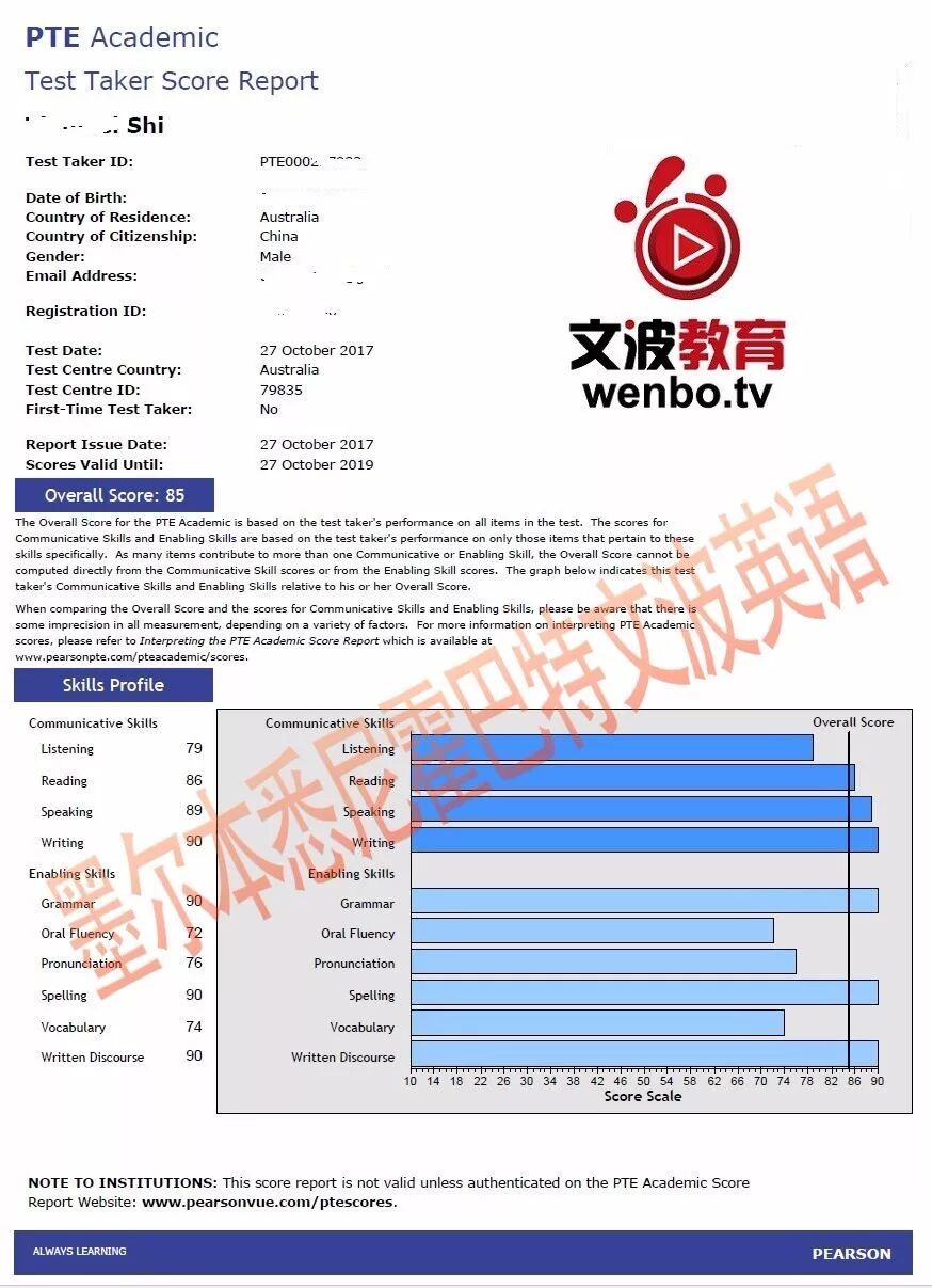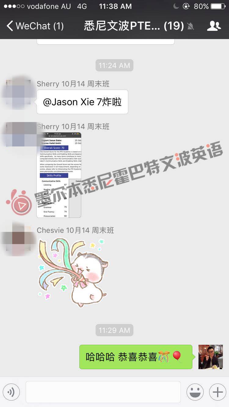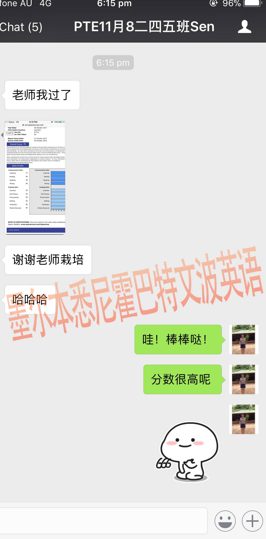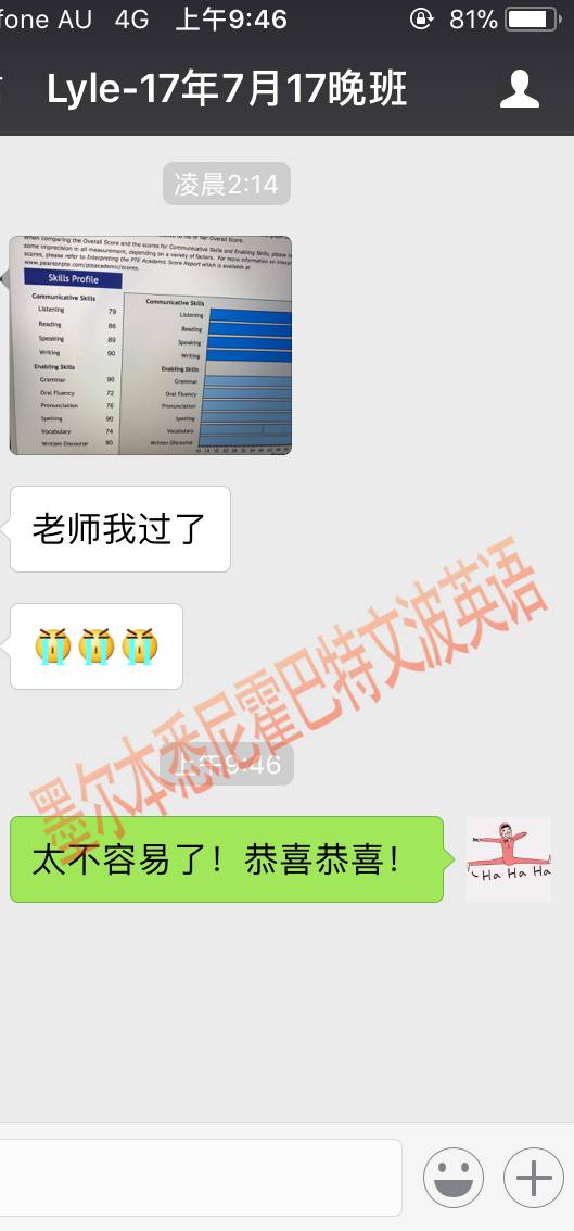 恭喜墨尔本悉尼霍巴特文波PTE学员Lyle同学获得听力79,阅读86,口语89,写作90,总分85分的好成绩!也是十月文波PTE第81位通过四个七四个八的学员.