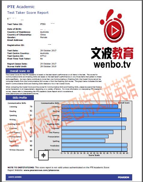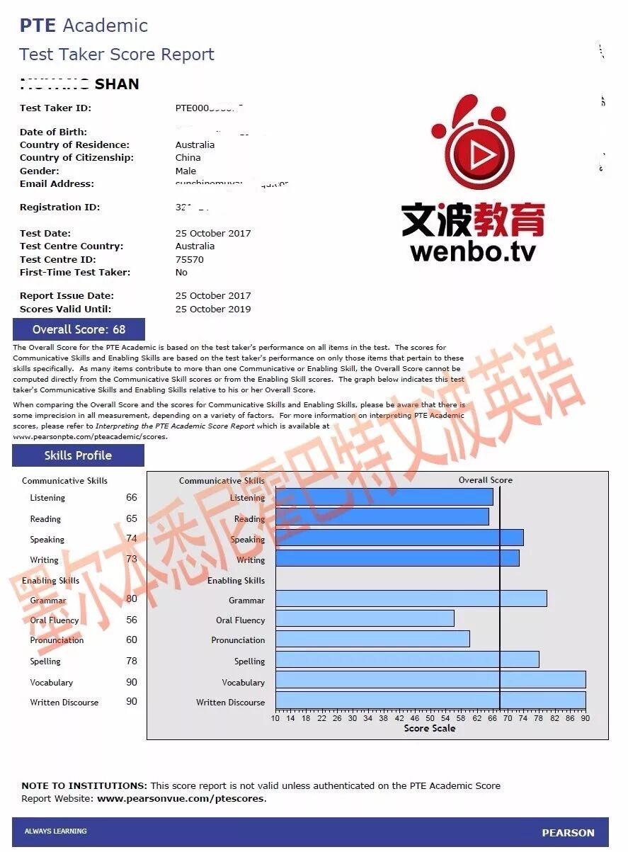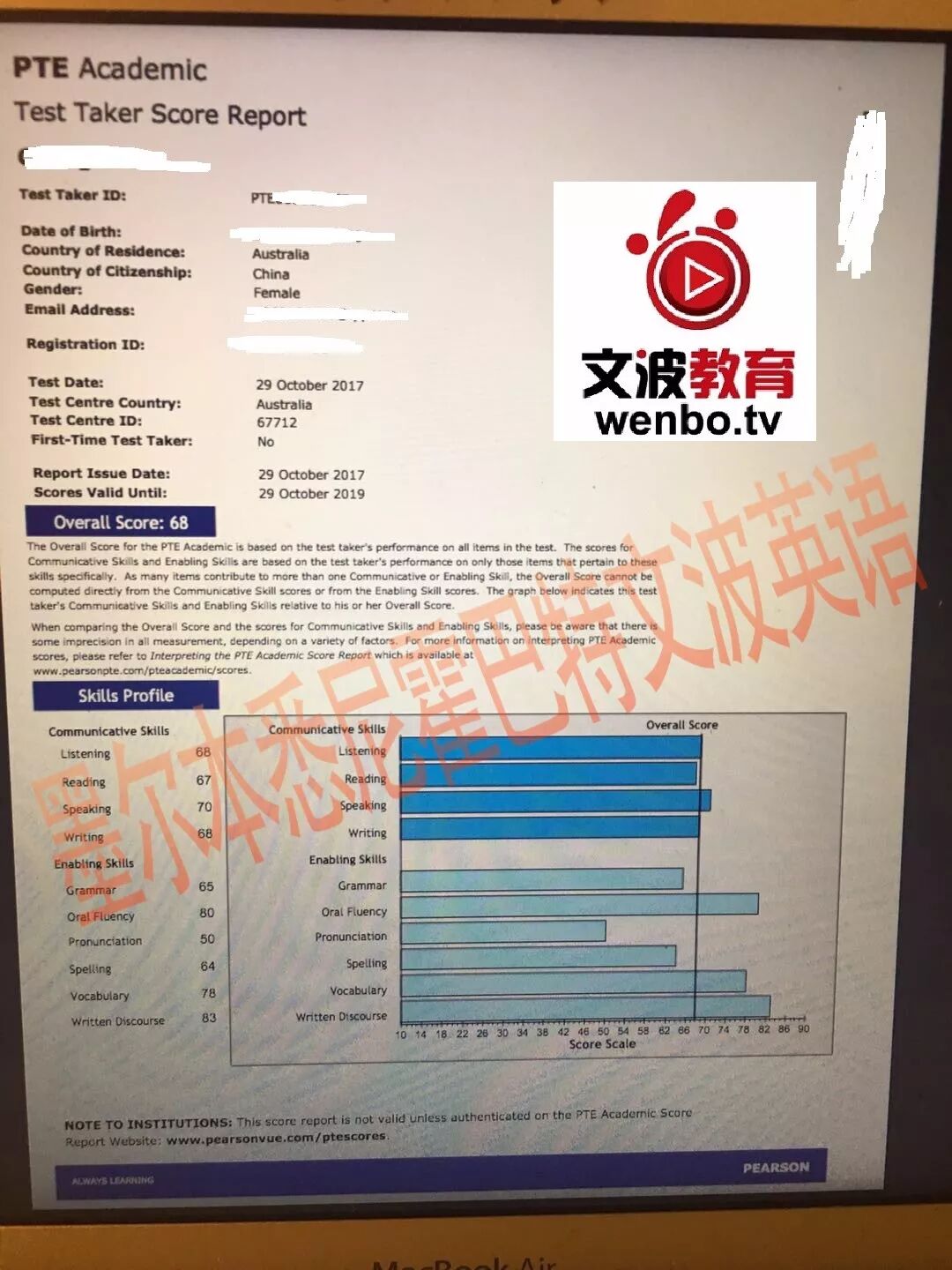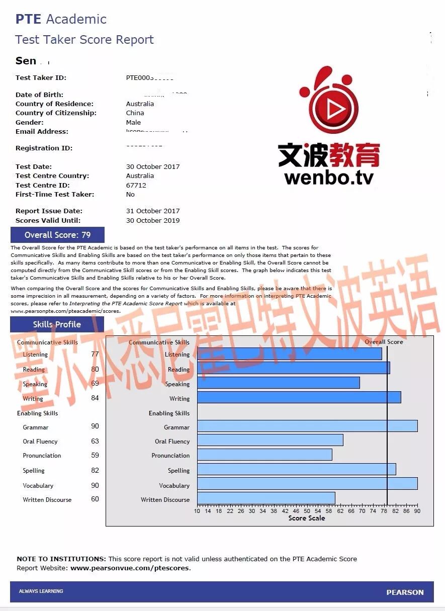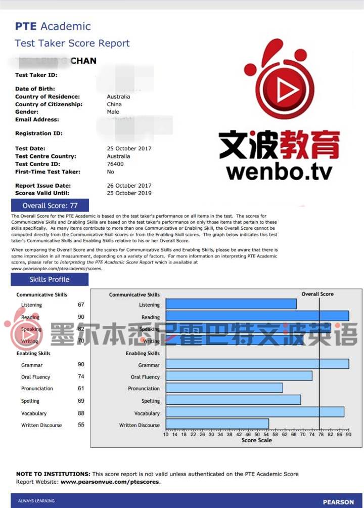 恭喜墨尔本悉尼霍巴特文波PTE学员Sen同学获得听力77,阅读80,口语69,写作84,总分79分的好成绩!也是十月文波PTE第86位通过四个七四个八的学员.