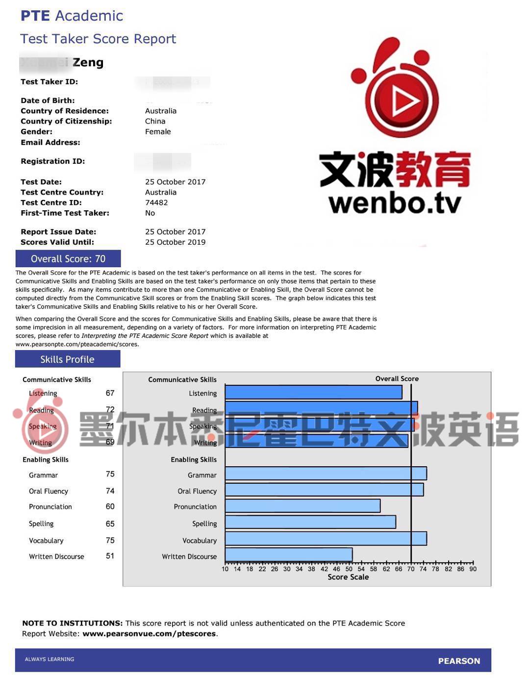 恭喜墨尔本悉尼霍巴特文波PTE学员Chesvie同学获得听力67,阅读72,口语71,写作69,总分70分的好成绩!也是十月文波PTE第82位通过四个七四个八的学员.