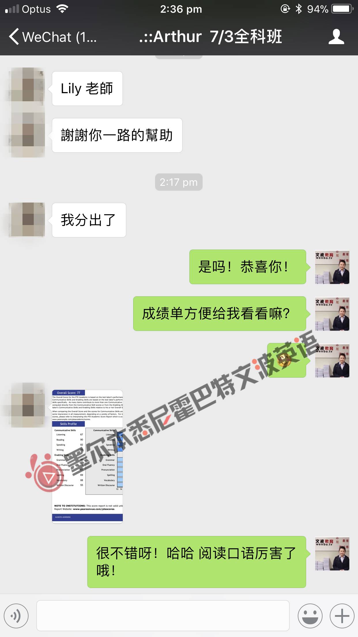 恭喜墨尔本悉尼霍巴特文波PTE学员Arthur同学获得听力67,阅读90,口语82,写作70,总分77分的好成绩!也是十月文波PTE第83位通过四个七四个八的学员.