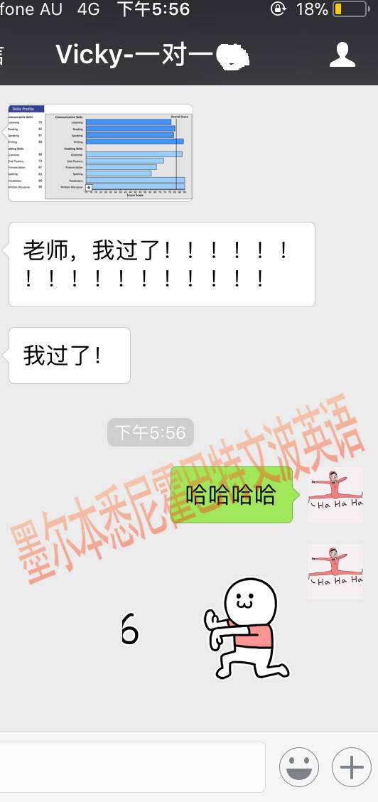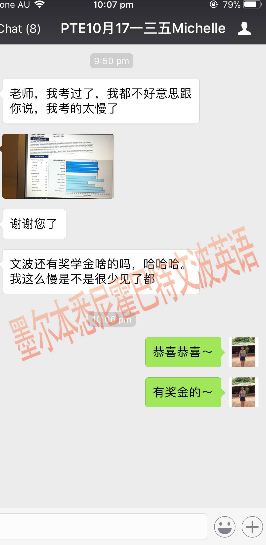 恭喜墨尔本悉尼霍巴特文波PTE学员Vicky同学获得听力79,阅读82,口语81,写作89,总分83分的好成绩!也是十月文波PTE第84位通过四个七四个八的学员.