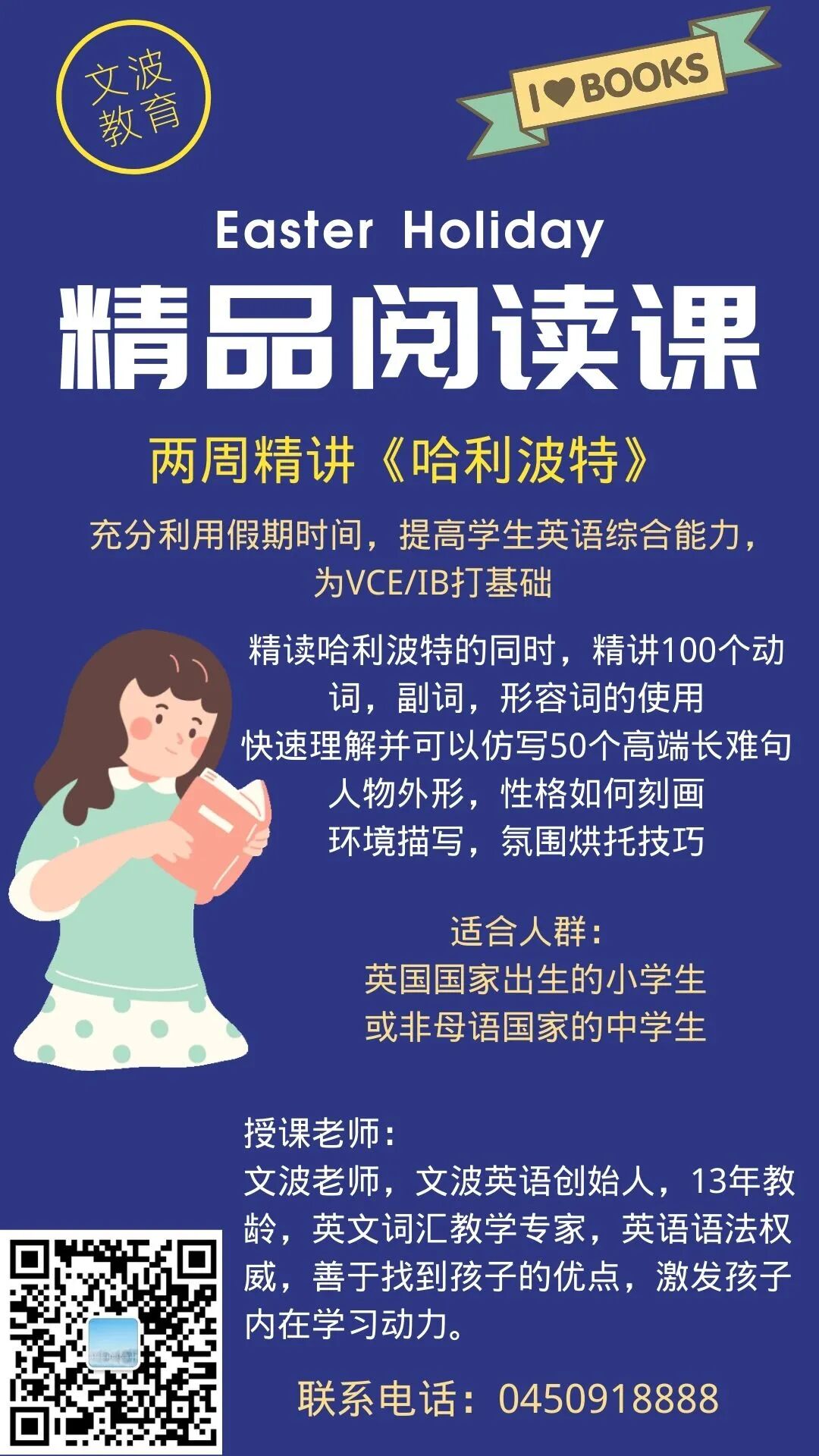 很多母语是中文的同学,想要参加维州私校奖学金考试,或者Naplan想要考出好成绩,VCE,IB想要突破,但是英文阅读量和英语母语的同学有一定差距,在这些考试上占劣势,甚至很多同学对英文阅读兴趣不大,针对这个问题,文波老师设计了文波精品阅读课,帮助大家找到英文阅读的兴趣,提升自己。