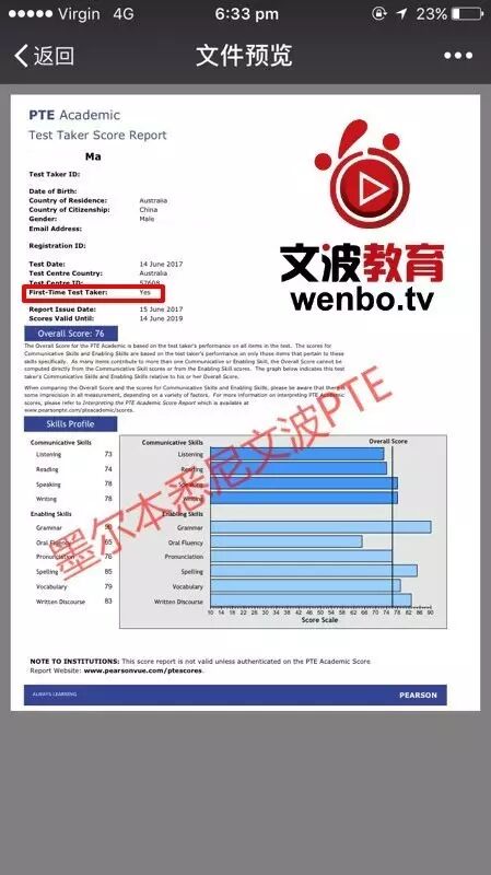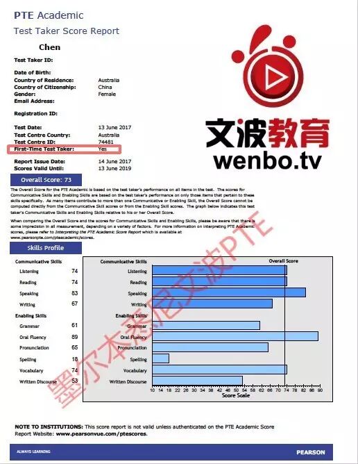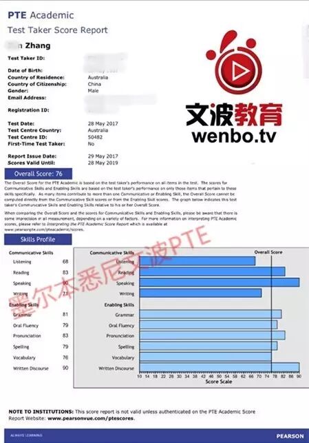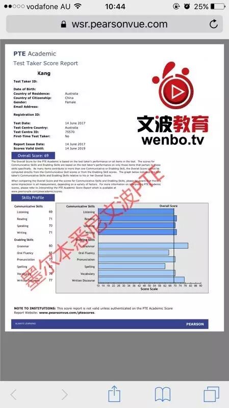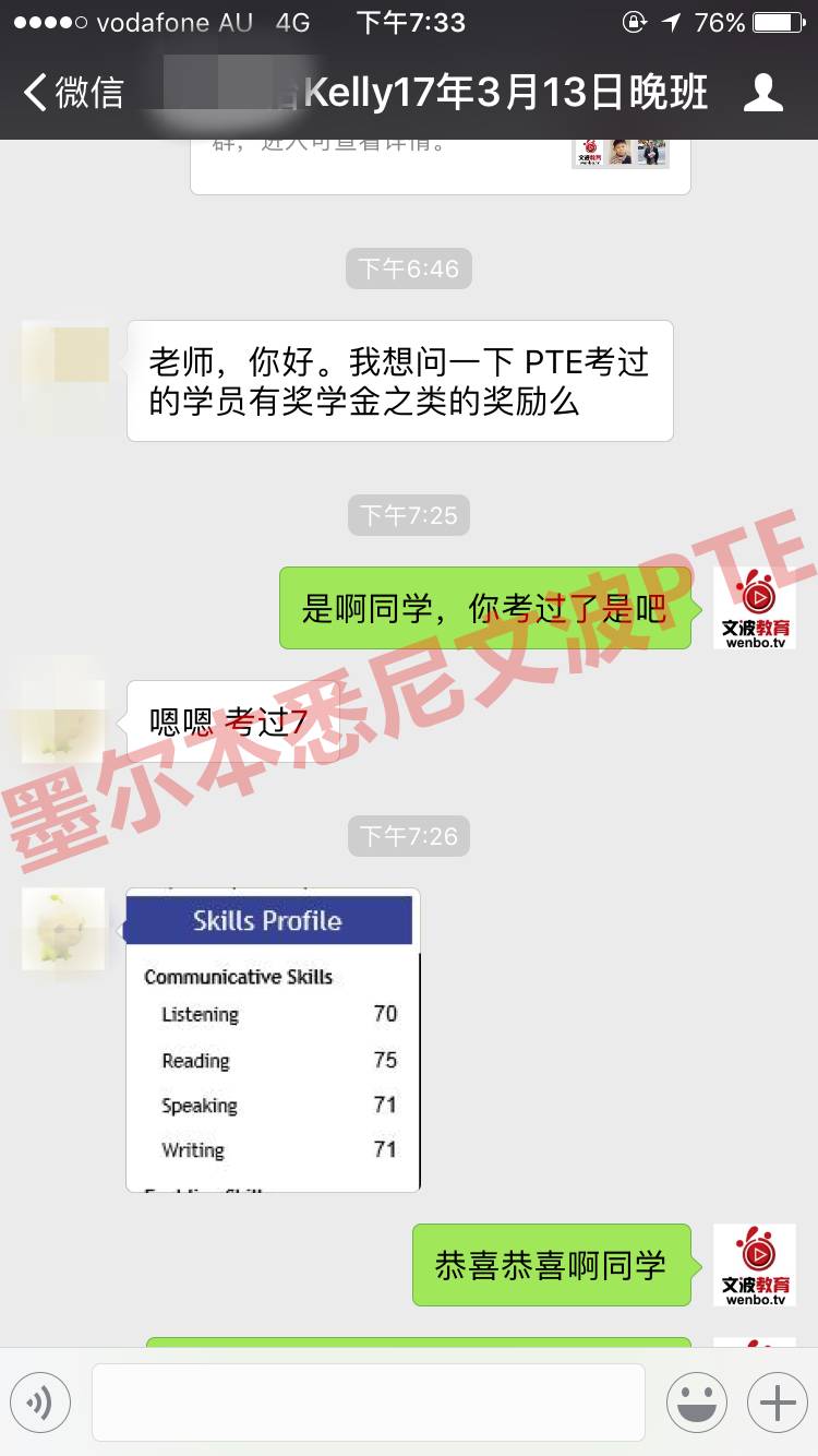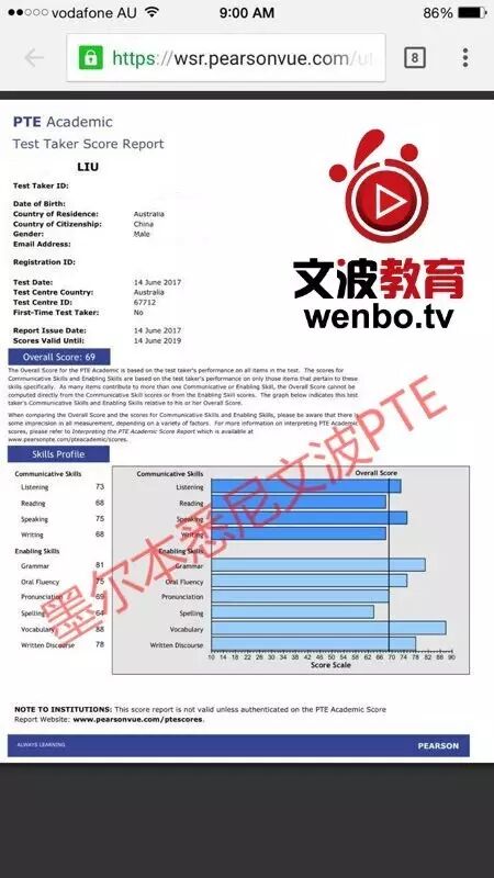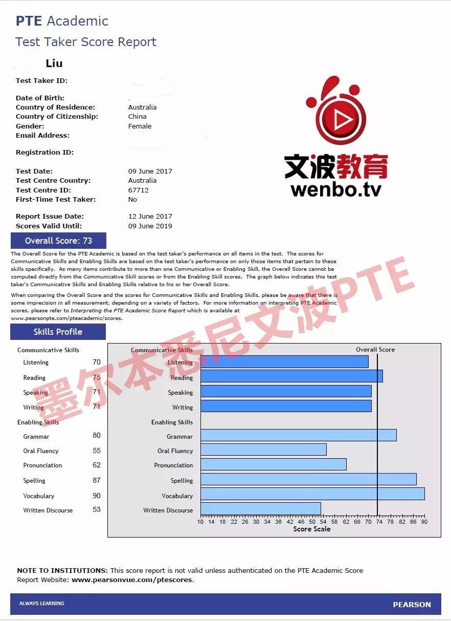 恭喜墨尔本悉尼文波PTE学员Jerry获得听力73,阅读68,口语75,写作68,总分69分的好成绩!也是六月文波PTE第35位通过四个七四个八的学员.