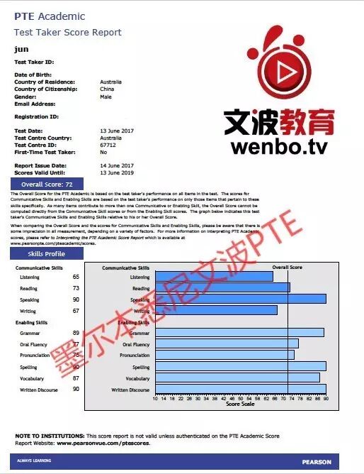 恭喜墨尔本悉尼文波PTE学员Jun获得听力65,阅读73,口语90,写作67,总分72分的好成绩!也是六月文波PTE第37位通过四个七四个八的学员.
