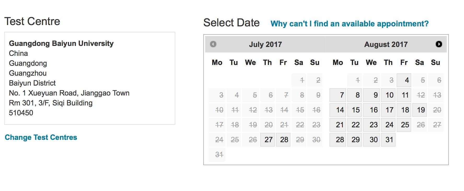 大家可以看到8月份这个考场还有大量的考位,而且最近属于澳洲旅游淡季,往返广州的机票也只要500澳币,非常适合短期有考试需求,签证压力大的同学。与其在墨尔本或者悉尼等着,不如去广州走一趟,不但可以考试,还可以顺便游一下广州,换一种环境和心情,可能更容易考到哦!