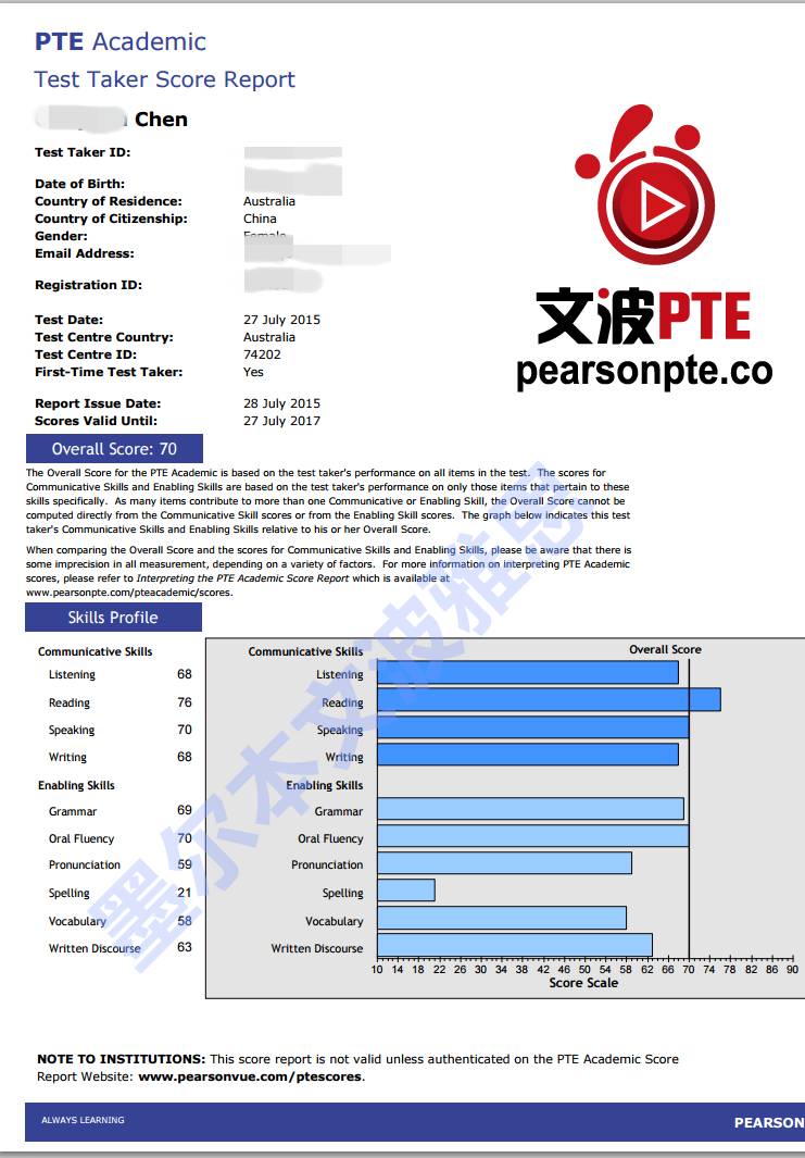 捷报连连,又一位同学Chen通过PTE四个65分! posted in PTE高分榜 on 2016 年 1 月 13 日 by 文波教育 恭喜Chen同学一次就考到PTE四个65分,取得听力68,阅读76,口语70,写作68,总分70分的好成绩!前几天,她将这个好消息告诉了我们,恭喜她! Chen也是之前考雅思考了很多次,总是到不了四个七,转PTE考试之后,经过两周的学习,一次就通过考试!之前最怕的写作在PTE里,那都不算事儿。 您可能感兴趣的文章还有: 下个月就能递!恭喜文波PTE六月第26位通过学员Lisa高分通过四个七四个八! 恭喜墨尔本文波PTE6月第2位通过学员Tia高分四个七! 一天10位PTE四个7四个8高分学员-文波陪伴,PTE不难! 恭喜墨尔本文波PTE六月第23位通过学员Sara高分四个7四个8!