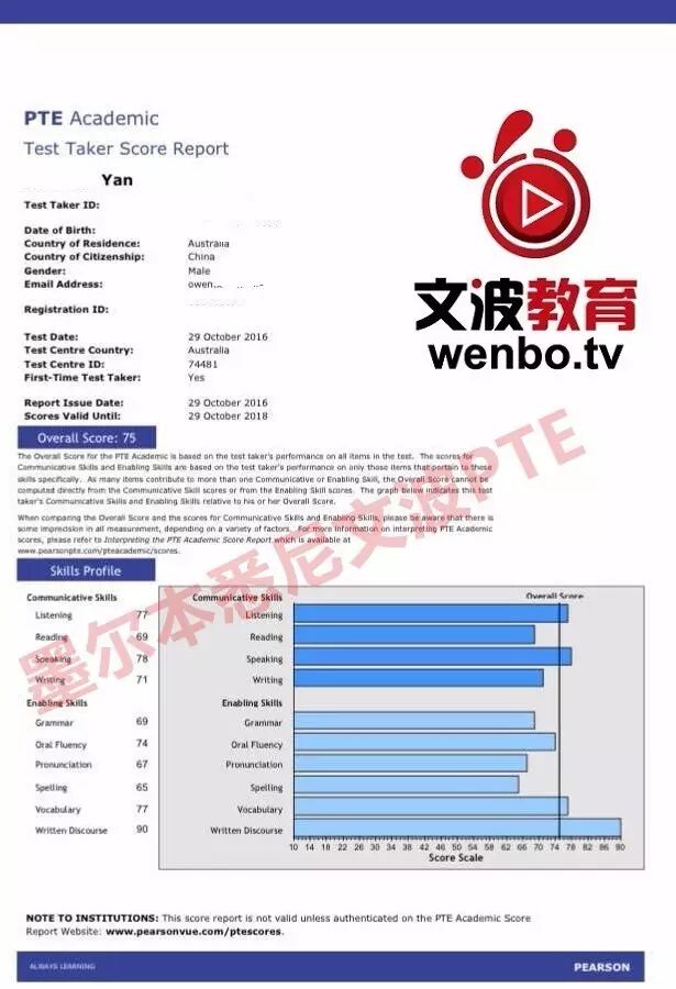 恭喜墨尔本悉尼文波PTE学员Owen在10月29号取得听力77,阅读69,口语78,写作71,总分75的好成绩!也是十月文波PTE第115位通过四个七四个八的学员!他也应邀给我们分享了他的备考经验: