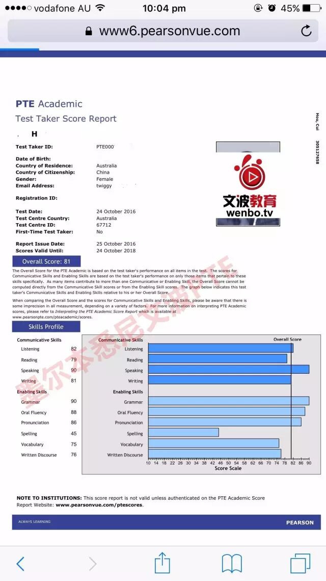 恭喜墨尔本悉尼文波PTE学员Twiggy在10月25号取得听力82,阅读79,口语90,写作81,总分81的好成绩!也是十月文波PTE第89位通过四个七四个八的学员!她也应邀给大家分享了她的备考经验: