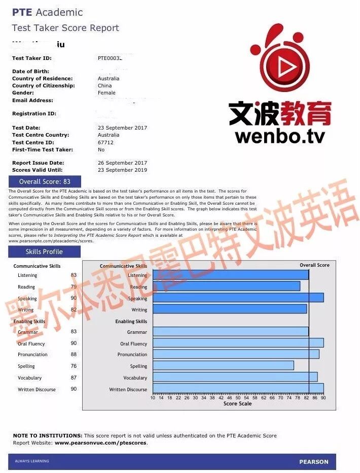墨尔本PTE-恭喜悉尼霍巴特墨尔本文波PTE学员Millie获得听力83,阅读79,口语90,写作82,总分83分的好成绩!